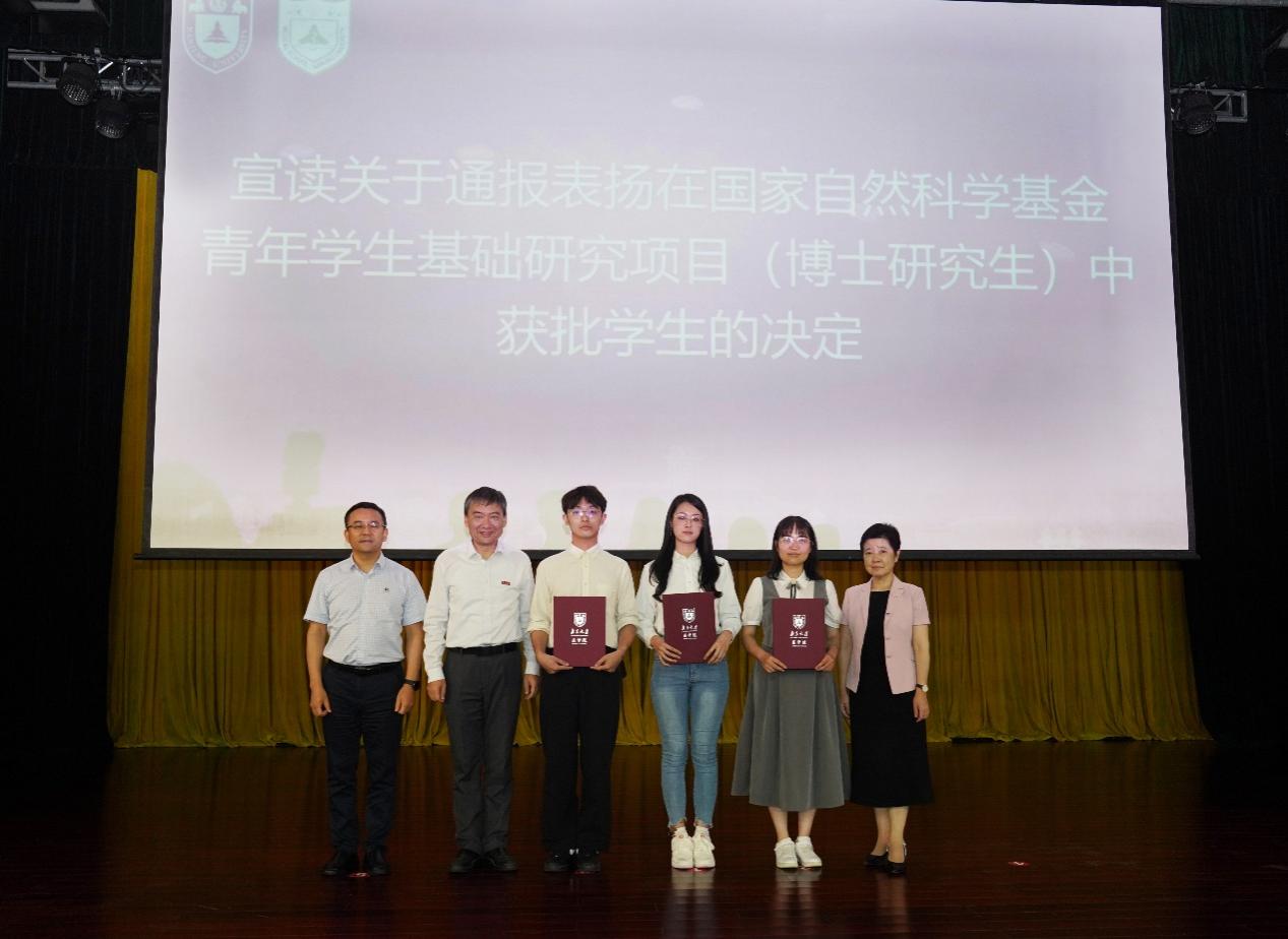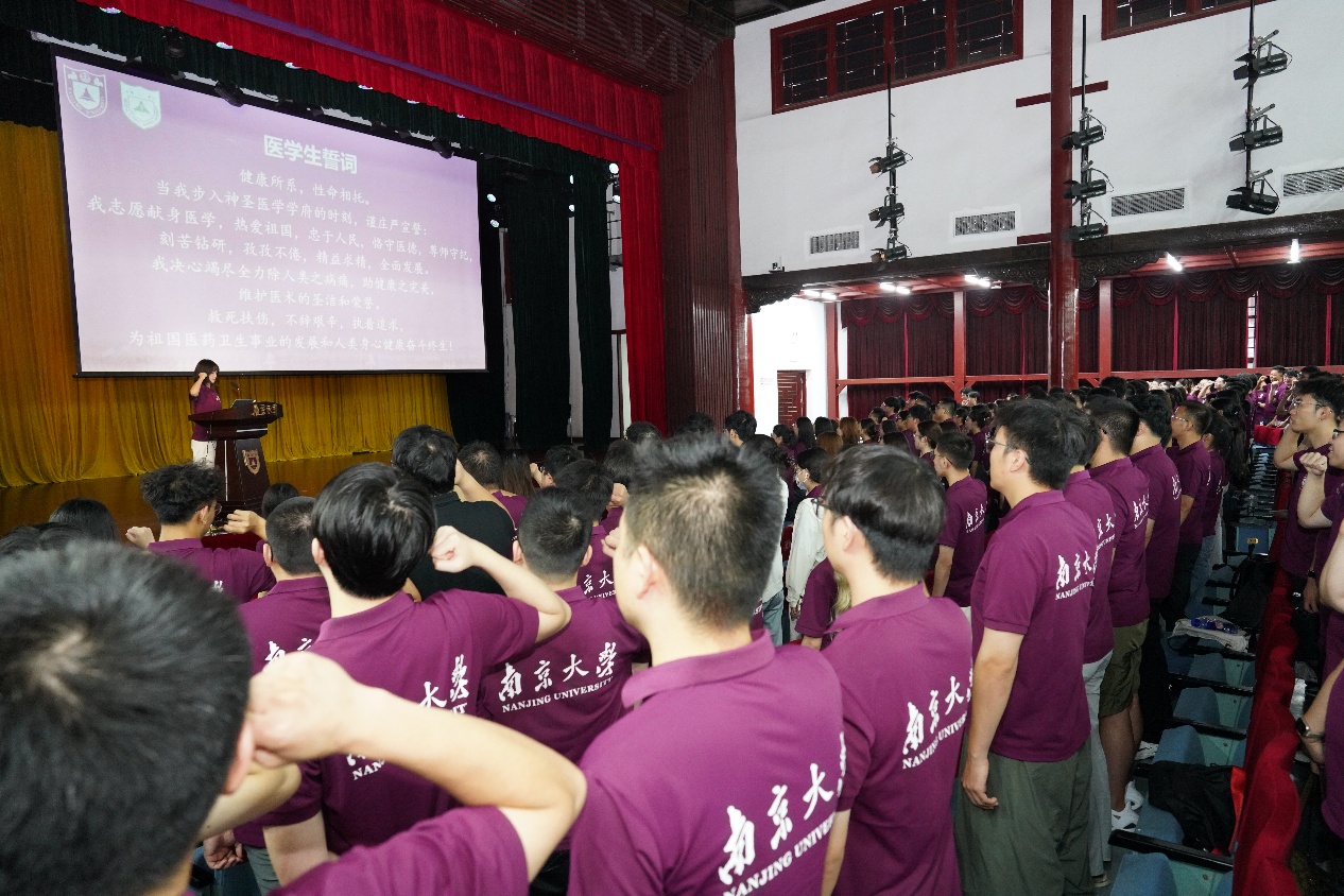 随后,与会领导和嘉宾为新生代表佩戴南京大学校徽。王宏伟宣读了《关于通报表扬在国家自然科学基金青年学生基础研究项目(博士研究生)中获批学生的决定》。全体同学以热烈掌声向背后默默付出的全体教师致以教师节问候。2025级硕士研究生陈一丹带领全体新生庄严宣誓。誓言铿锵有力,展现了医学生的坚定信念和决心。
