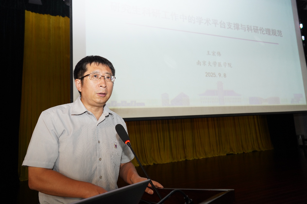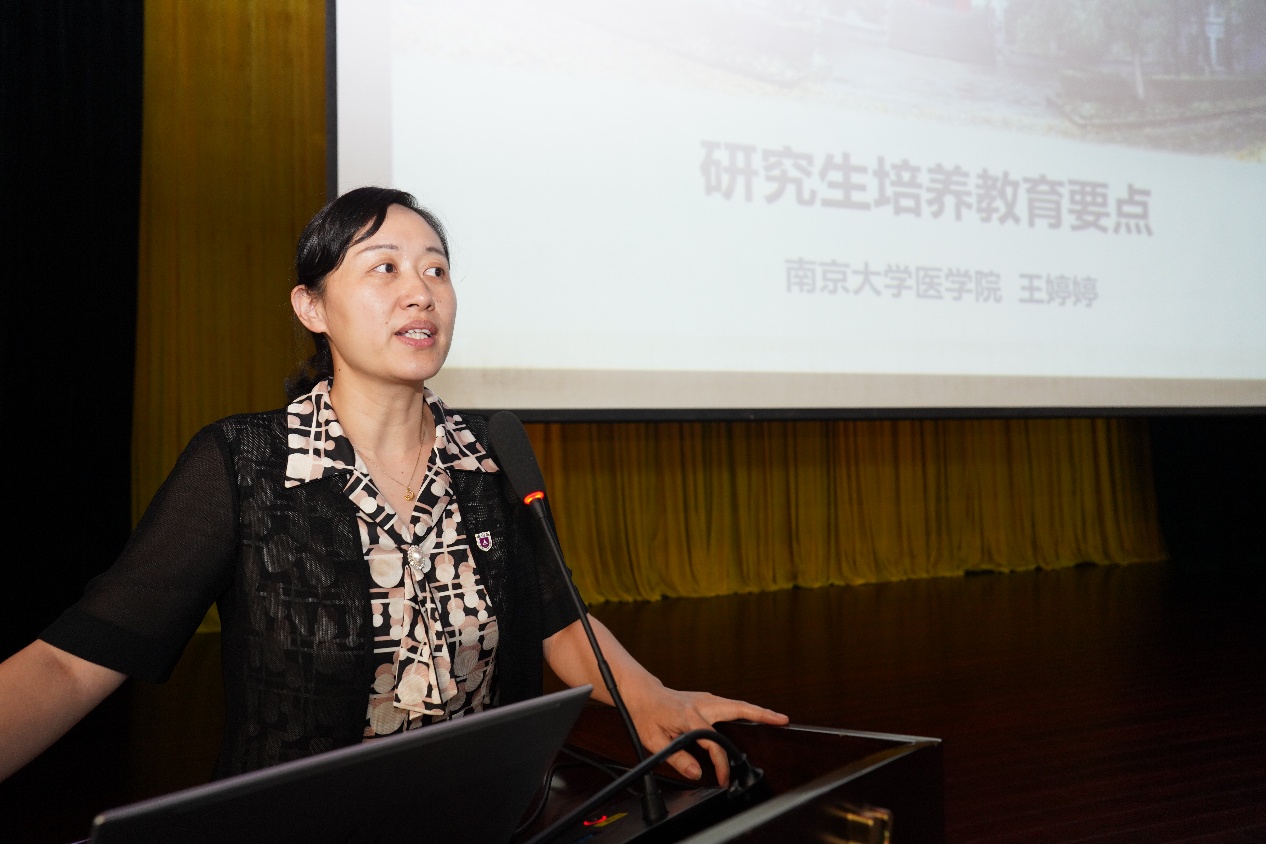 吴锦慧介绍了学院历史沿革、组织架构等方面情况,强调“做科研要有高度、做临床要有温度”;王宏伟介绍了学院的学术平台、强调了科研伦理规范;王婷婷介绍了研究生培养教育要点,对培养方案、学位标准、奖助体系等进行了详细的解读;办公室主任应锋用案例警示学生们要注意实验室安全与操作规范;南京大学图书馆资深馆员陈秋宜示范了文献检索、数据获取与图书馆医学资源利用技巧。