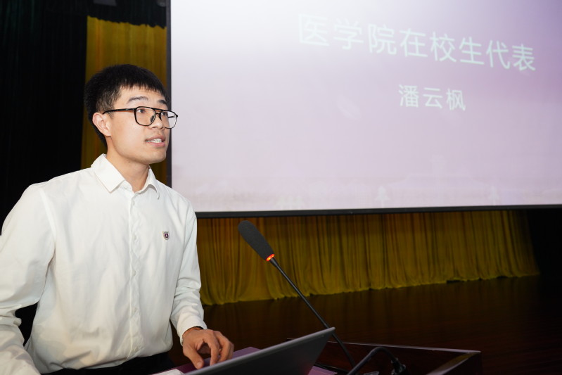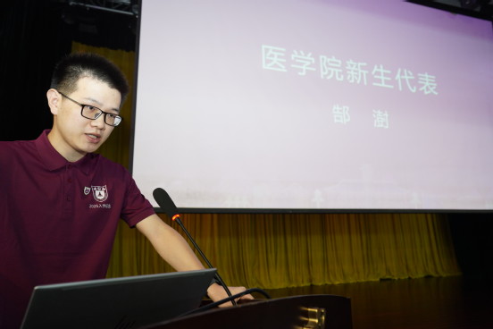 新生代表2025级博士生郜澍以“不做‘差不多’医生”为主题发言,表示将认真学习、严于律己、注重细节,为祖国医疗卫生事业和人民健康保驾护航。