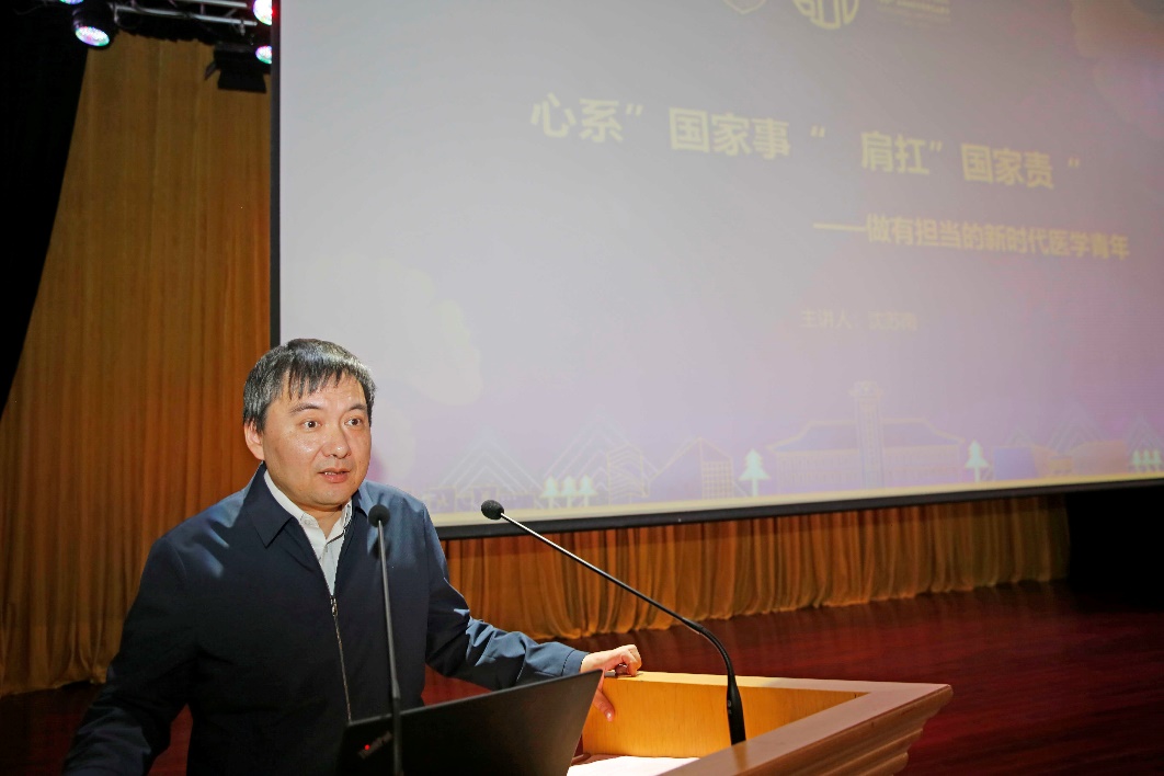 在随后的新生入学教育讲座中,医学院党委书记沈苏南老师以《心系“国家事”,肩扛“国家责”》为题,详细阐述了“作为新时代的医学生该如何做”的问题。沈书记寄语全体医学生应带着习近平总书记的殷切嘱托,运用自身专业知识,讲好医学院的中国故事。医学院党委副书记、副院长蒋青老师围绕“学院发展脉络”,向同学们讲述了医学院的发展历程与发展方向,嘱咐大家要把握医学院与时代脉搏的交汇要点。