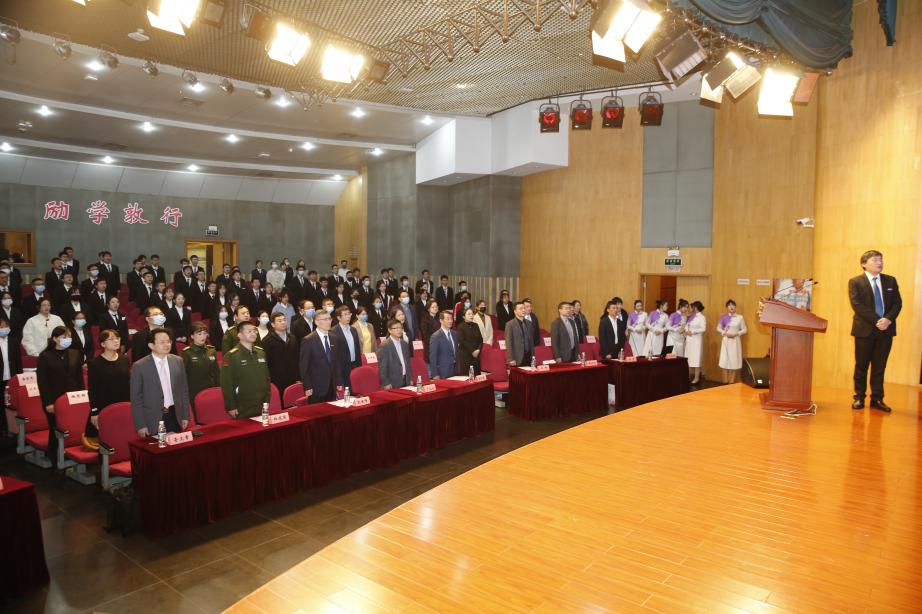 下午两点,参会全体师生齐唱校歌,仪式正式开始。张峻峰、沈苏南、于成功、杜建国、杨旭东、查文章、柏峰、蒋青等共同为医学院2022级106位新生授予白大衣和听诊器。在雄浑、厚重的校歌背景音乐中,老师们为新生同学披上白大衣,挂上听诊器,送上他们的美好的祝福和殷切期望。