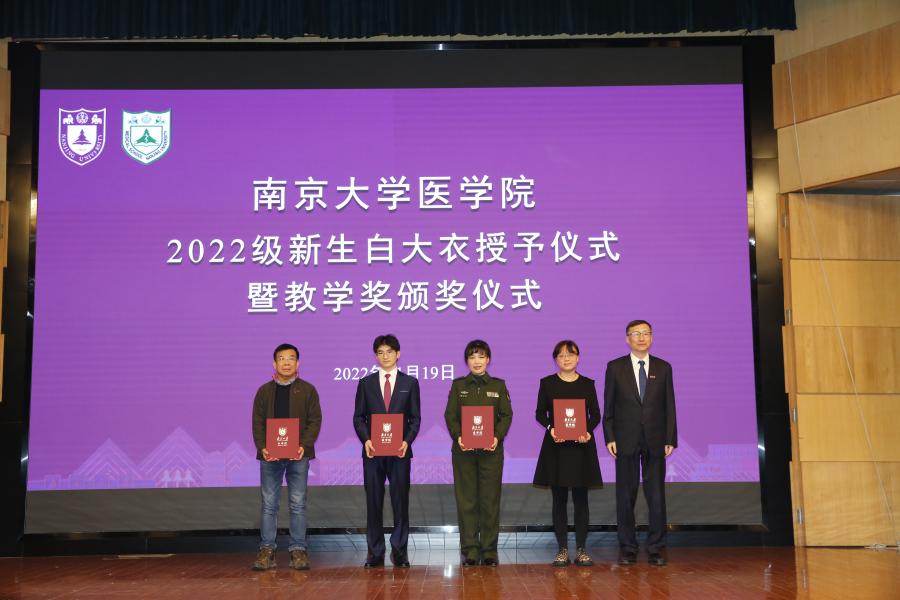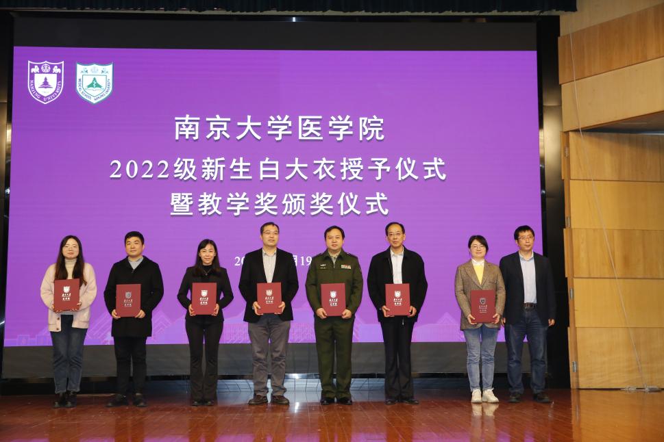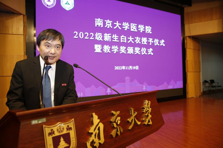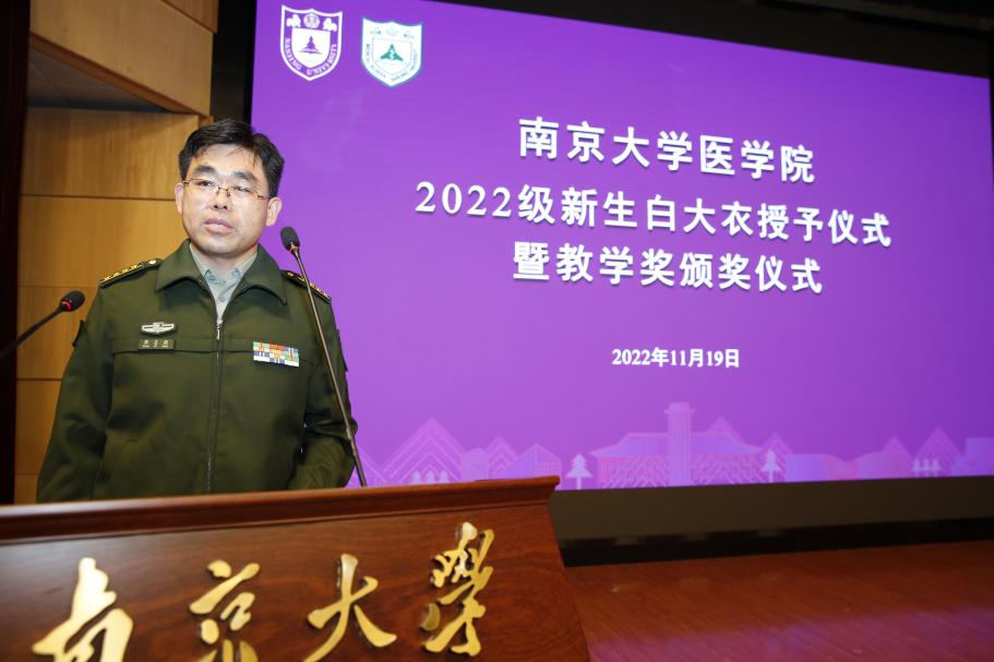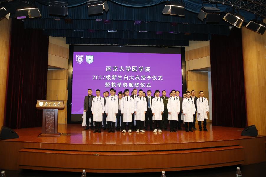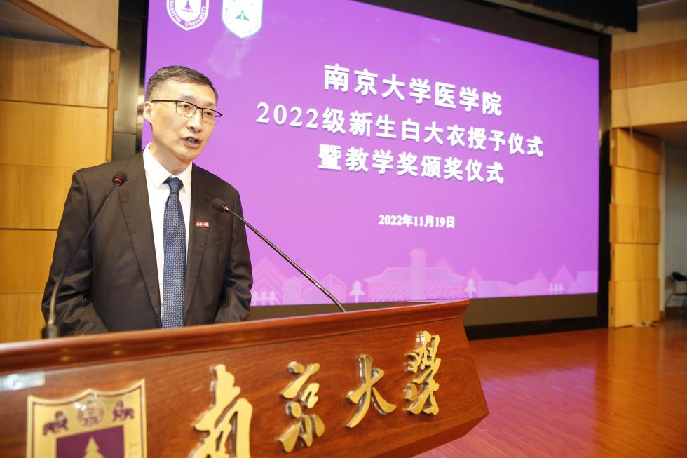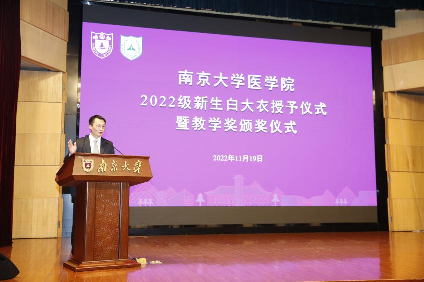 2022年11月19日下午,南京大学医学院2022级新生白大衣授予仪式暨医学院教学奖颁奖仪式在鼓楼校区科技馆一楼报告厅顺利举行。南京大学党委常委、副校长、医学院院长张峻峰,附属鼓楼医院院长于成功,附属金陵医院(解放军东部战区总医院)大校副政治委员杜建国,附属口腔医院院长杨旭东、副院长吴文蕾,附属盐城第一医院党委书记查文章,附属泰康仙林鼓楼医院副院长柏峰,南京市儿童医院副院长莫绪明,南京脑科医院副院长姚志剑,南京市第二医院副院长殷国平,附属南京国际医院(筹)副院长李毅明,医学院党委副书记、副院长蒋青,党委副书记王阿妮,副院长王宏伟,安邦书院学生事务中心主任吴可,南京大学医学院校友代表、1998级校友周梦良以及各附属医院和教学医院分管教学的领导和老师出席活动。医学院党委书记沈苏南主持仪式。