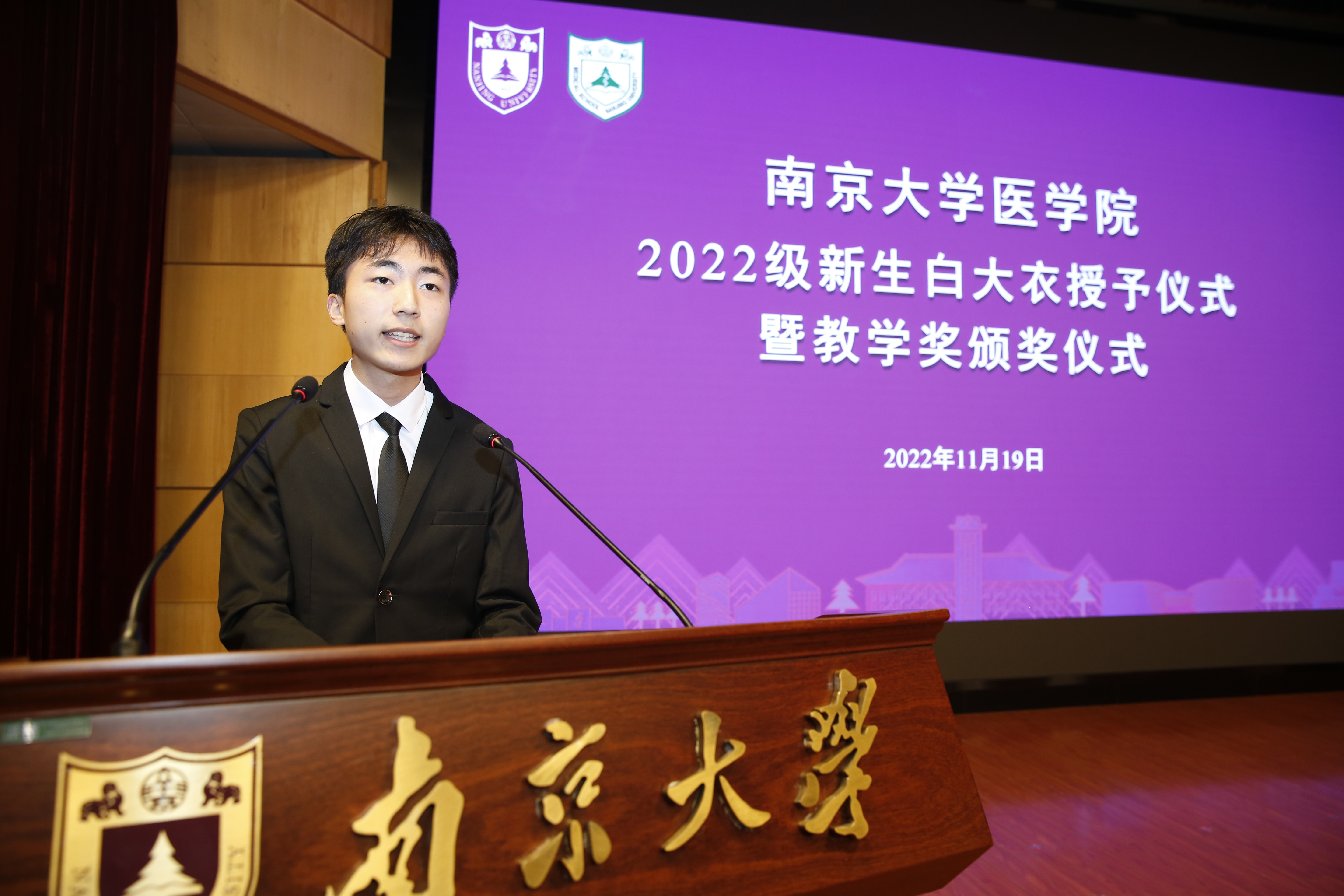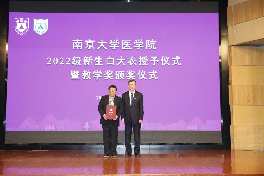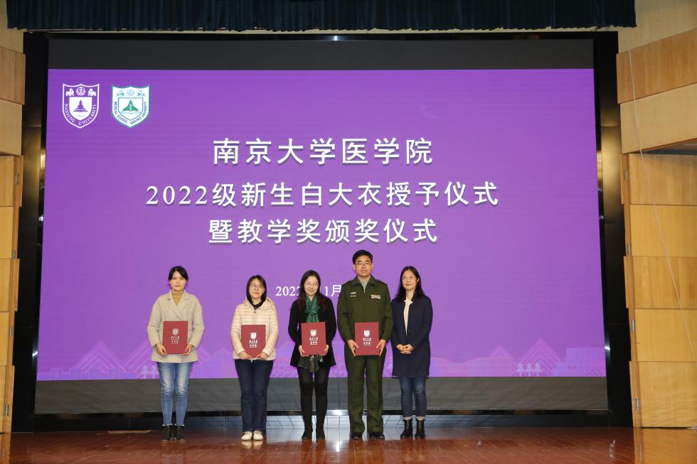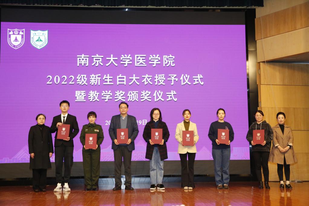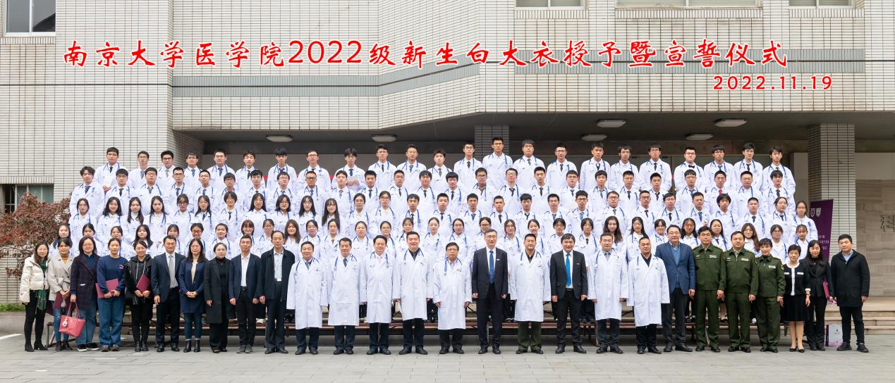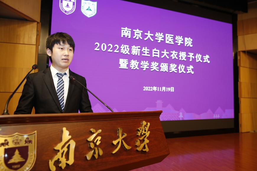 2022年11月19日下午,南京大学医学院2022级新生白大衣授予仪式暨医学院教学奖颁奖仪式在鼓楼校区科技馆一楼报告厅顺利举行。南京大学党委常委、副校长、医学院院长张峻峰,附属鼓楼医院院长于成功,附属金陵医院(解放军东部战区总医院)大校副政治委员杜建国,附属口腔医院院长杨旭东、副院长吴文蕾,附属盐城第一医院党委书记查文章,附属泰康仙林鼓楼医院副院长柏峰,南京市儿童医院副院长莫绪明,南京脑科医院副院长姚志剑,南京市第二医院副院长殷国平,附属南京国际医院(筹)副院长李毅明,医学院党委副书记、副院长蒋青,党委副书记王阿妮,副院长王宏伟,安邦书院学生事务中心主任吴可,南京大学医学院校友代表、1998级校友周梦良以及各附属医院和教学医院分管教学的领导和老师出席活动。医学院党委书记沈苏南主持仪式。