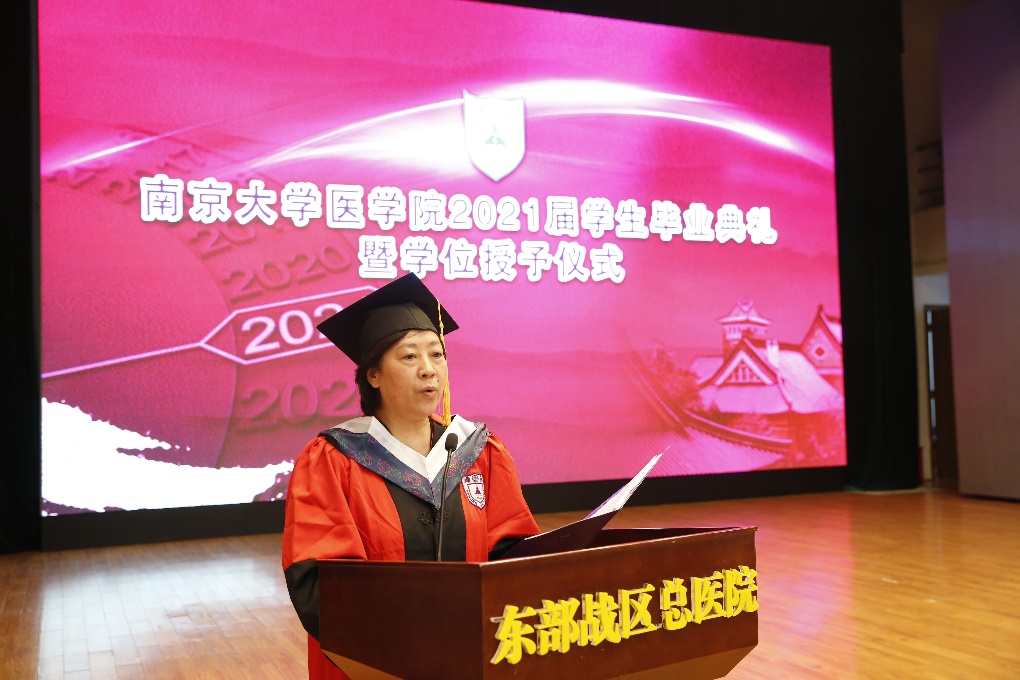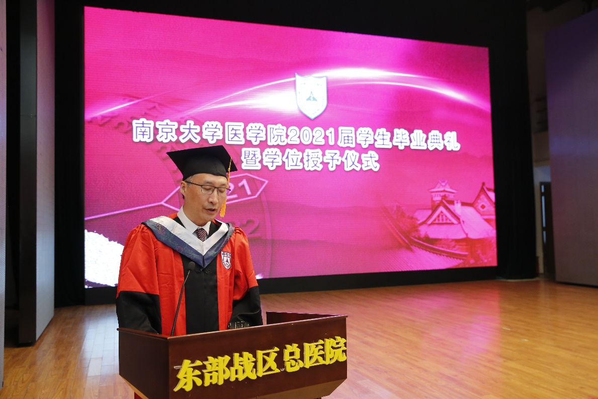 南京大学党委常委、副校长、医学院院长张峻峰在致辞中指出,今年是建党百年华诞,在南京大学119年的的发展历程中,在每一次重大考验面前,诚朴雄伟的南大人总是怀着对国家和民族高度的责任感,挺立风骨、坚守担当,努力在危机中育新机、于变局中开新局。张校长分享三点期待:一、大医精诚,在选择中坚守初心。希望同学们保持南京大学这座百年学府赋予大家的人文情怀,做一个有仁心大爱、有责任担当的好医生和医学工作者。二、求真务实,在历练中增长才干。同学们要在担当中历练,在工作中成长,在只争朝夕、不负韶华的拼搏奋斗中成就非凡的人生。三、胸怀天下,在奋斗中书写青春中国。责任在肩,使命在前,同学们当厚植国家情怀,努力实现个人成长与民族国家发展同频共振。张校长关心每一位毕业生,希望大家常回家看看!