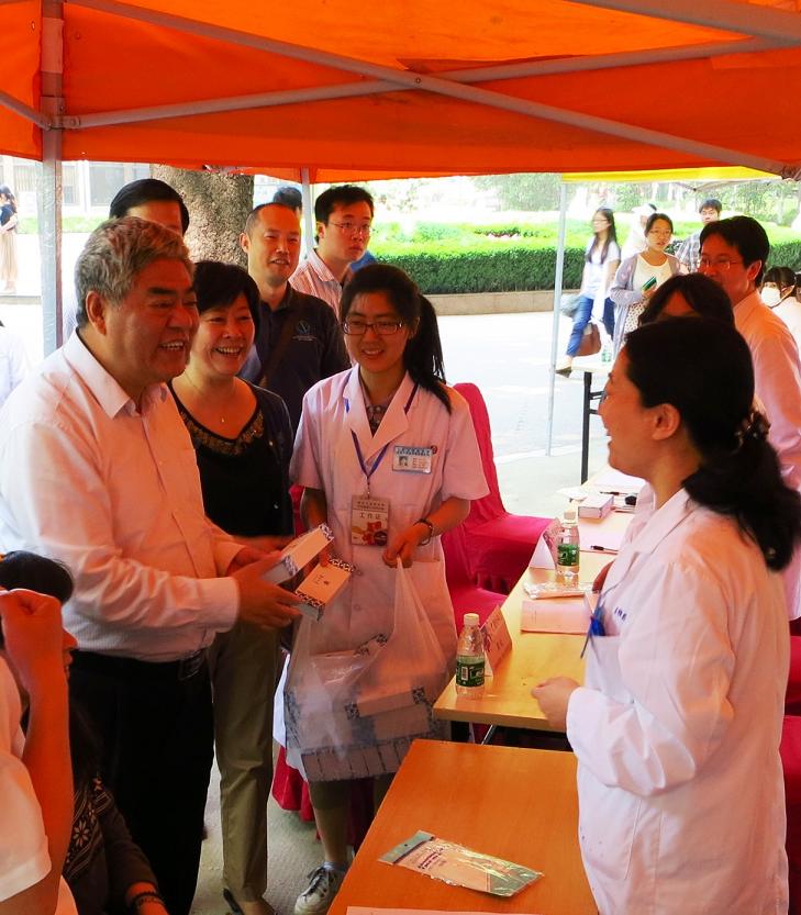 南京大学党委书记洪银兴和副书记任利剑以及校友总会副会长张锁庚等校领导来到了活动的现场,慰问参加义诊的校友们,并为他们颁发了纪念品。洪书记和校友们热情握手,感谢他们情系母校,能够利用自己所学服务师生,并勉励他们在今后的工作中创造更好的成绩。