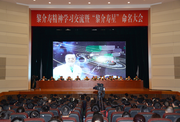 浩瀚星空,又一颗小行星被刻上中国人的名字。他就是中国工程院院士、南京大学医学院附属金陵医院军区南京总医院副院长黎介寿。4月25日下午,黎介寿精神学习交流暨“黎介寿星”命名大会在南京大学医学院附属金陵医院南京军区南京总医院举行。南京军区蔡英挺司令员、郑卫平政委和中国科学院领导为黎介寿院士颁发小行星命名证书、小行星照片和纪念匾。江苏省李学勇省长、中国科学院詹文龙副院长、中国工程院樊代明副院长、南京市缪瑞林市长、南京大学党委洪银兴书记、孙义燧院士、医学院院长刘志红院士等600余人参加会议。