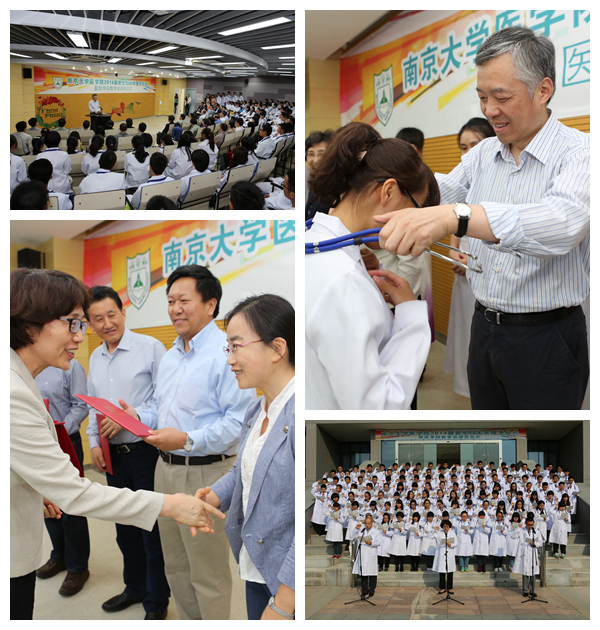 白大衣授予仪式于下午两点准时开始,伴随着庄严的校歌,医学院2014级新生们八人一组,依次走上主席台,南京大学张异宾书记、医学院刘志红院长、韩晓冬书记、蒋青副院长、李朝军副院长、附属金陵医院茅建华副院长、附属鼓楼医院胡娅莉副院长、附属口腔医院孙卫斌副院长亲手为他们穿上白大衣,挂上听诊器,气氛庄重而神圣。