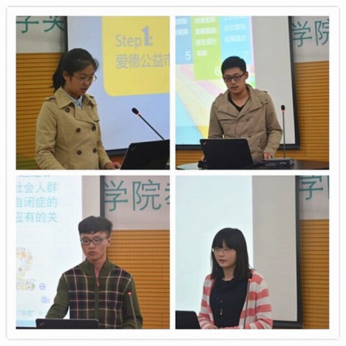 在嘉宾们精彩的发言之后,参与2014暑期社会实践的团队逐一进行了汇报分享。今年,我院共立项12支暑期社会实践团队,其中6支入选校级团队,它们分别是:“狱见温暖”公益行团队(被评为“校十佳团队”)、“纽”工作营·与你为伴--江苏省麻风康复村志愿行团队(被评为“校优秀团队”)、 “走进星星的世界”——关爱自闭症儿童的生活状况与社会诉求团队、破冰行动——医患关系调研与改善团队、扬州市宝应县河水水质检验及使用情况调查团队以及四季屋暑期社会实践团队。团队负责人们淋漓尽致地阐述分享了各自团队的实践选题、实践过程以及实践成果等,为在场嘉宾与同学们呈现了一段段生动的实践故事,赢得了现场观众热烈的掌声。