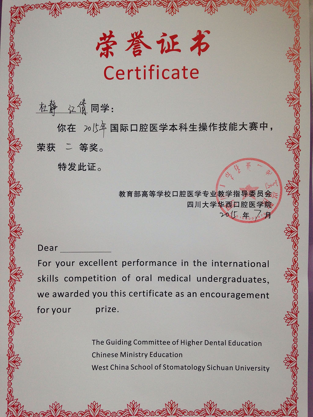 7月16日,由教育部高等学校口腔医学专业教学指导委员会主办,四川大学华西口腔医学院承办的“2015年国际口腔医学本科生操作技能大赛”在四川成都隆重举行。我院由口腔医学专业七年制本科生杜静、江倩组成代表队参加了此次比赛,经过激烈角逐,最终以优异的成绩荣获大赛二等奖。
