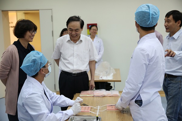 参观现场,医学院刘志红院长向陈骏校长介绍了医学院“一体两翼”的教学发展思路,即依托仙林校区基础医学教育中心和鼓楼校区临床模拟教学中心,开展贯穿始终的医学人文教育、贯穿始终的科研能力培养和贯穿始终的临床技能训练,贯彻南京大学“办中国最好的本科教育”的方针。医学院副院长沈苏南向陈骏校长一行介绍了临床模拟教学中心的组织构架和教学实践活动等方面情况,并详细解释了中心教学、示教、操作、考核等多功能一体化的培训模式,现场医学院的老师和学生也向陈骏校长一行展示了各临床操作项目。当陈校长得知现场操作的就是今年代表南京大学在第六届全国高等医学院校大学生临床技能竞赛中获奖的同学,十分高兴,高度赞扬了同学们娴熟及稳健的临床操作技能,对同学们为南京大学取得的荣誉表示感谢。陈校长肯定了医学院在教学方面的投入,肯定了中心前期建设工作取得的成绩,并强调了临床模拟教学中心在人类健康教育事业中的意义和重要地位,希望中心能够为培养高素质的卓越医学人才和创新人才提供保障,为社会作更大的贡献。