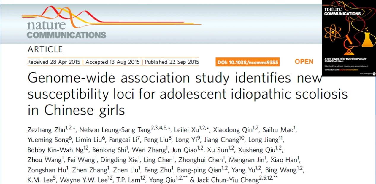 医学院附属鼓楼医院脊柱外科邱勇教授带领的研究团队在汉族青少年特发性脊柱侧凸遗传病因学领域取得重要发现,相关成果以原创性论著(Original Article)的形式发表在《自然-通讯》(Nature Communications)杂志上。该工作由南京大学医学院附属鼓楼医院和香港中文大学附属威尔斯亲王医院(即南京大学-香港中文大学脊柱侧凸联合研究中心)合作完成。南京大学医学院附属鼓楼医院朱泽章教授、徐磊磊医生和香港中文大学邓亮生教授共同完成了全基因组芯片数据分析验证和论文撰写。通讯作者分别为南京大学医学院附属鼓楼医院邱勇教授和香港中文大学郑振耀教授。