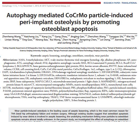 近期,南京大学医学院附属金陵医院、南京军区南京总医院骨科赵建宁教授带领的团队在人工关节无菌性松动机制研究方面取得重要发现。相关成果在线发表于《Autophagy》杂志上(影响因子11.753)。题目为:“Autophagy mediated CoCrMo particle-induced peri-implant osteolysis by promoting osteoblast apoptosis”。通讯作者为南京大学医学院附属金陵医院骨科主任赵建宁教授和南京大学董磊、张峻峰教授,南京大学医学院博士研究生王振恒为文章的第一作者。在这篇文章中,研究人员证实人工关节长期使用后产生的CoCrMo磨损微粒可以通过自噬促进成骨细胞的凋亡,从而参与人工关节无菌性松动的发生,下调自噬可以抑制骨溶解。这项研究从一个全新的角度阐明了人工关节无菌性松动的新机制,为这类疾病的治疗干预提供了新的靶点。