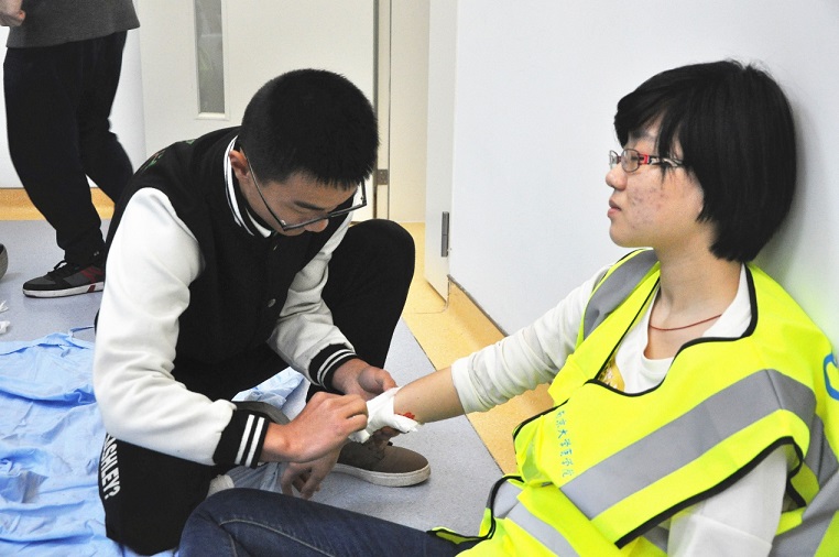 与第一期课程相比,本学期的《智者生存》进一步增加了灾难事故的种类,对急救的五大基本技能:止血、包扎、固定、搬运、心肺复苏进行了初步的操作标准化,将火灾爆炸、地震洪水、交通事故、核泄漏、生化灾害、心肺复苏进行了模块化分型和情景演练,最后设计火灾逃生和交通事故现场伤员救助的模拟演习,总课时增加到36个学时。