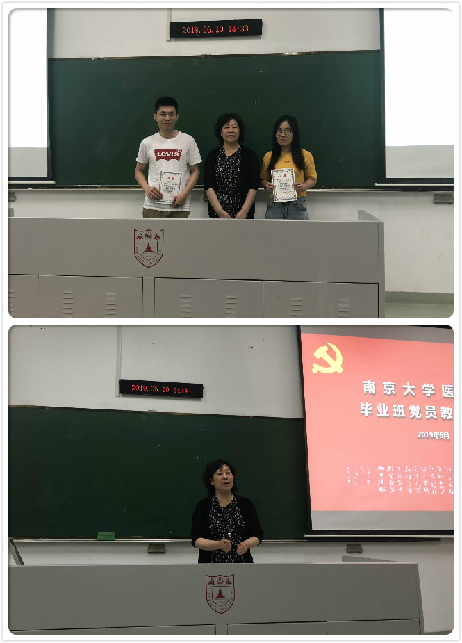 随后,陈恒静老师介绍了医学院研究生党员志愿服务工作,包括建邺区蓓蕾社区的结对医疗帮扶、支援其他单位开展高淳等地的医疗服务、开展“不忘初心,薪火相传”的健康咨询与科普活动。这些活动是医学院志愿活动的典范,体现了同学们的奉献精神。为了表彰大家的志愿服务精神,医学院在毕业生中评选了两位优秀志愿者——2017级博士艾世超和2016级硕士张翠平,韩晓冬书记为两位优秀志愿者颁奖。
