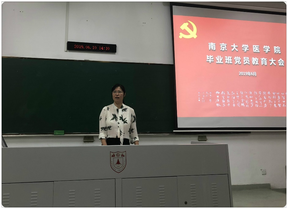 医学院副书记王阿妮老师主持大会,她提到这次会议将是同学们在校期间的最后一次组织生活,同时在介绍目前党建的总体形势时,用“严格”进行了精炼地概括,对毕业生们能够经受住党组织的考验表示肯定。
