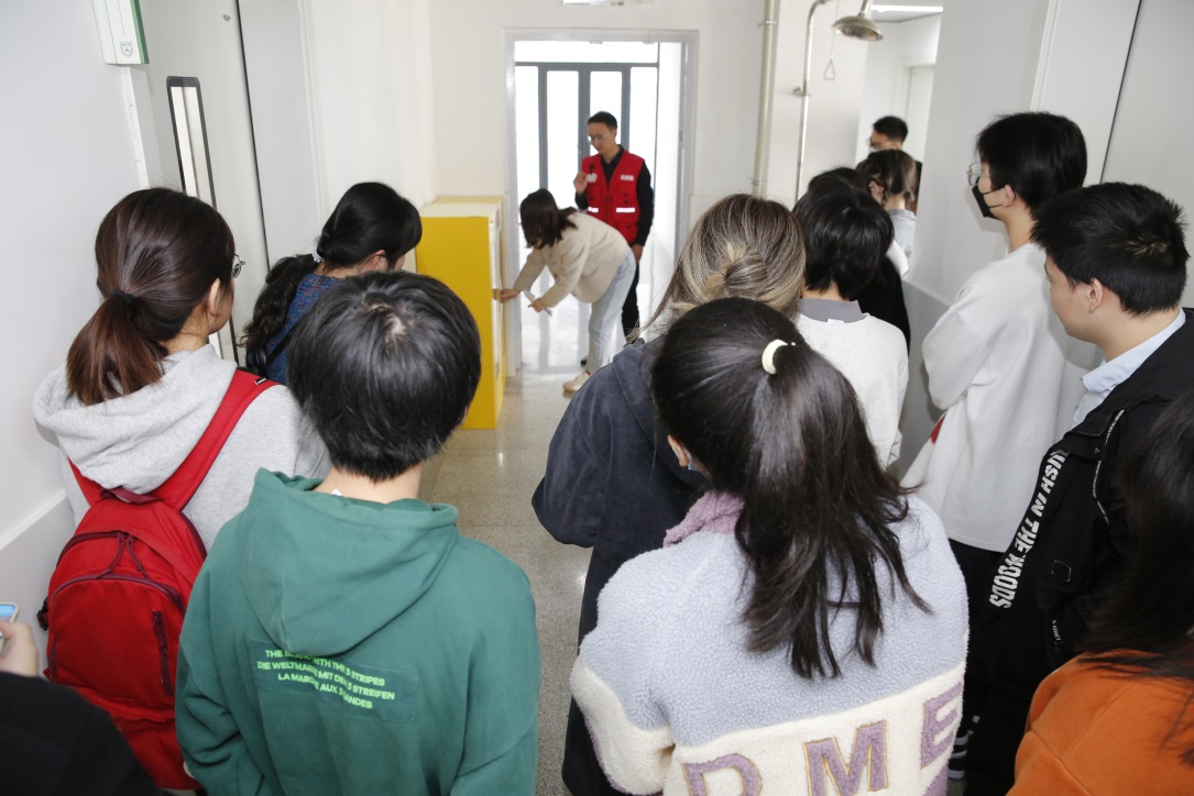 “动物咬伤环节”演练模拟了实验人员被实验鼠咬伤后的处置、汇报流程,向同学们介绍了各个实验室配备的急救药箱里药品种类和使用方法。