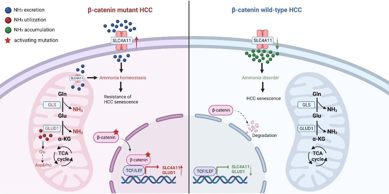 南京大学医学院附属鼓楼医院余德才等科研人员发现β-catenin激活突变的肝癌患者血氨升高,具有旺盛的氮代谢。异常激活的β-catenin主要通过谷氨酰胺分解代谢增加氨的合成。15NH4Cl代谢流结果显示,β-catenin的激活促进肝癌细胞利用氨生成谷氨酸、天冬氨酸和脯氨酸等其他代谢产物;并且 β-catenin 通过 LEF1 转录调控谷氨酸脱氢酶 GLUD1 促进氨的利用。同时β-catenin/TCF4诱导氨转运体 SLC4A11的转录,以排出多余的氨,SLC4A11在肝癌组织中表达上调,SLC4A11的高表达与不良预后相关。体内外实验证实,敲除SLC4A11通过阻断氨的排泄诱导肝癌细胞衰老并且抑制肿瘤的生长。此外,血氨水平的升高促进β-catenin突变型肝癌的进展,而敲除SLC4A11削弱了β-catenin突变型肝癌抵抗衰老的能力同时阻碍氨促进的β-catenin突变型肝癌的进展。