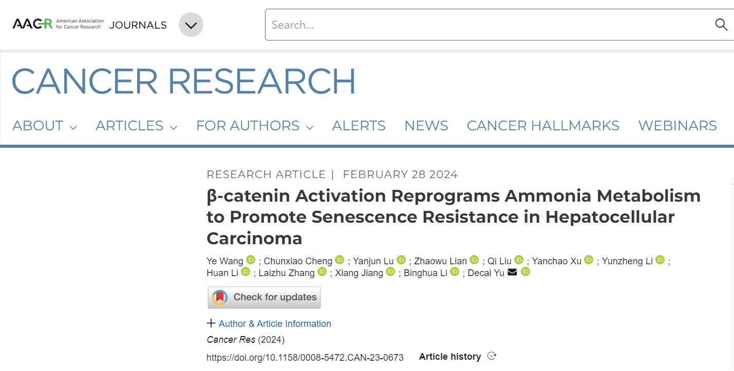 近日,南京大学医学院附属鼓楼医院肝胆与肝移植外科余德才教授团队题为“β-Catenin Activation Reprograms Ammonia Metabolism to Promote Senescence Resistance in Hepatocellular Carcinoma”的研究论文发表在国际期刊Cancer Research上。南京大学医学院毕业生王烨博士为该论文第一作者,南京大学医学院附属鼓楼医院余德才教授、黎兵华主治医师为该论文共同通讯作者。