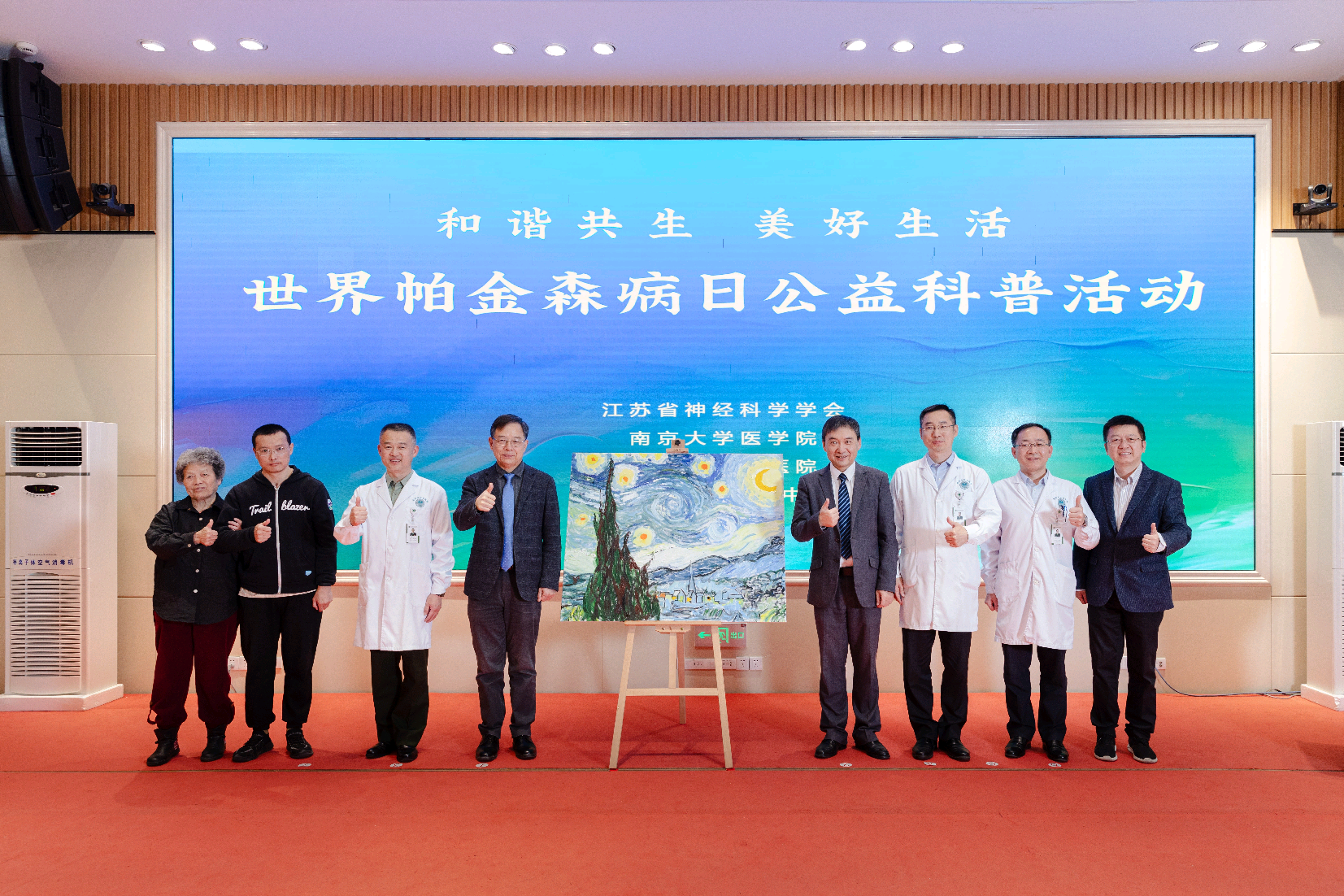 活动现场,南京大学医学院党委书记沈苏南、江苏省神经科学学会理事长谢维、南京大学医学院附属金陵医院副院长李鉴峰、神经内科主任朱武生、神经外科主任马驰原、江苏广电总台我苏国际传播中心副总监杨阳,以及帕金森病患者代表和家属共同完成了《星空》画作的最后部分,这一富有情感共鸣的创作瞬间成为活动高潮。这场别开生面的创作活动旨在积极呼吁全社会能够更加深入地理解帕金森病所带来的种种困扰和挑战,并倡导大家共同携手,给予帕金森病患者更多的关心和支持,让他们感受到来自社会的温暖与力量。