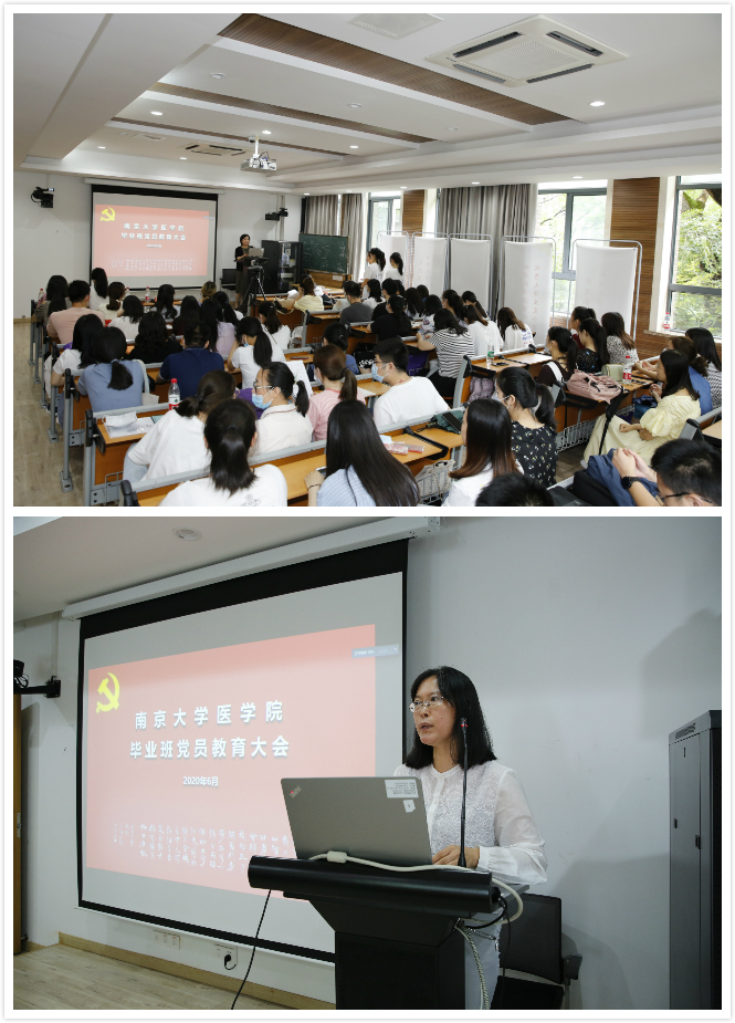 韩晓冬书记代表学院党委勉励同学们牢记南京大学医学院毕业生和共产党员的双重身份。她用优秀毕业生的事例表达了由衷的自豪,也希望本届毕业生到工作岗位后能够展现南京大学医学院学生的风采。今年的新冠疫情,据不完全统计,医学院有70多位校友前往武汉一线,舍小家为大家,充分展现了医学院毕业生在国家需要时的义无反顾与对生命的坚守。同时,韩书记强调,作为一名党员,在碰到大是大非问题时,要始终保持与党中央高度一致,在一些突发事件或者灾难发生时,要以国家利益和人民利益为重,面对困难,不畏艰险,在挑战面前,积极进取,勇挑重担。