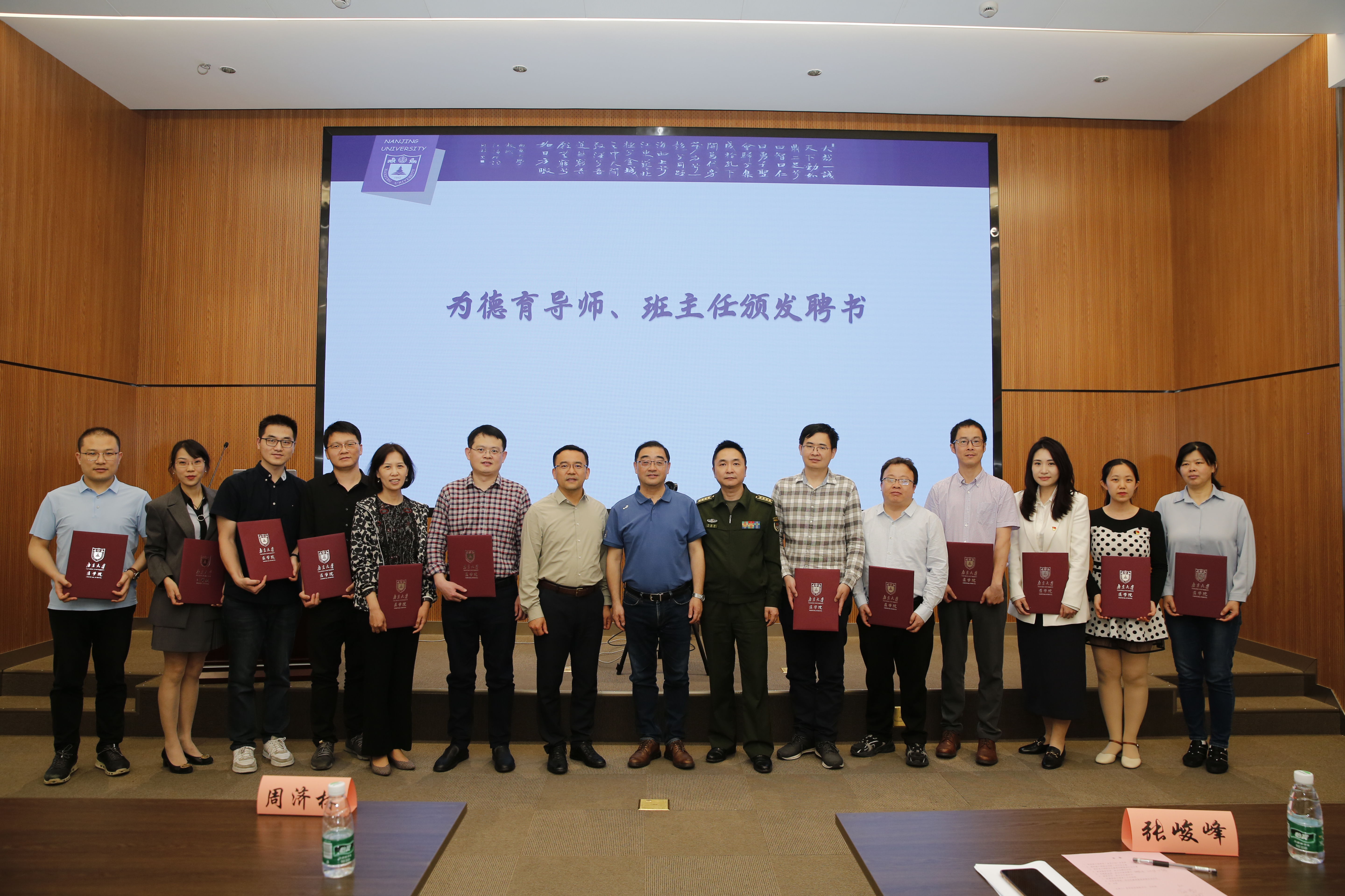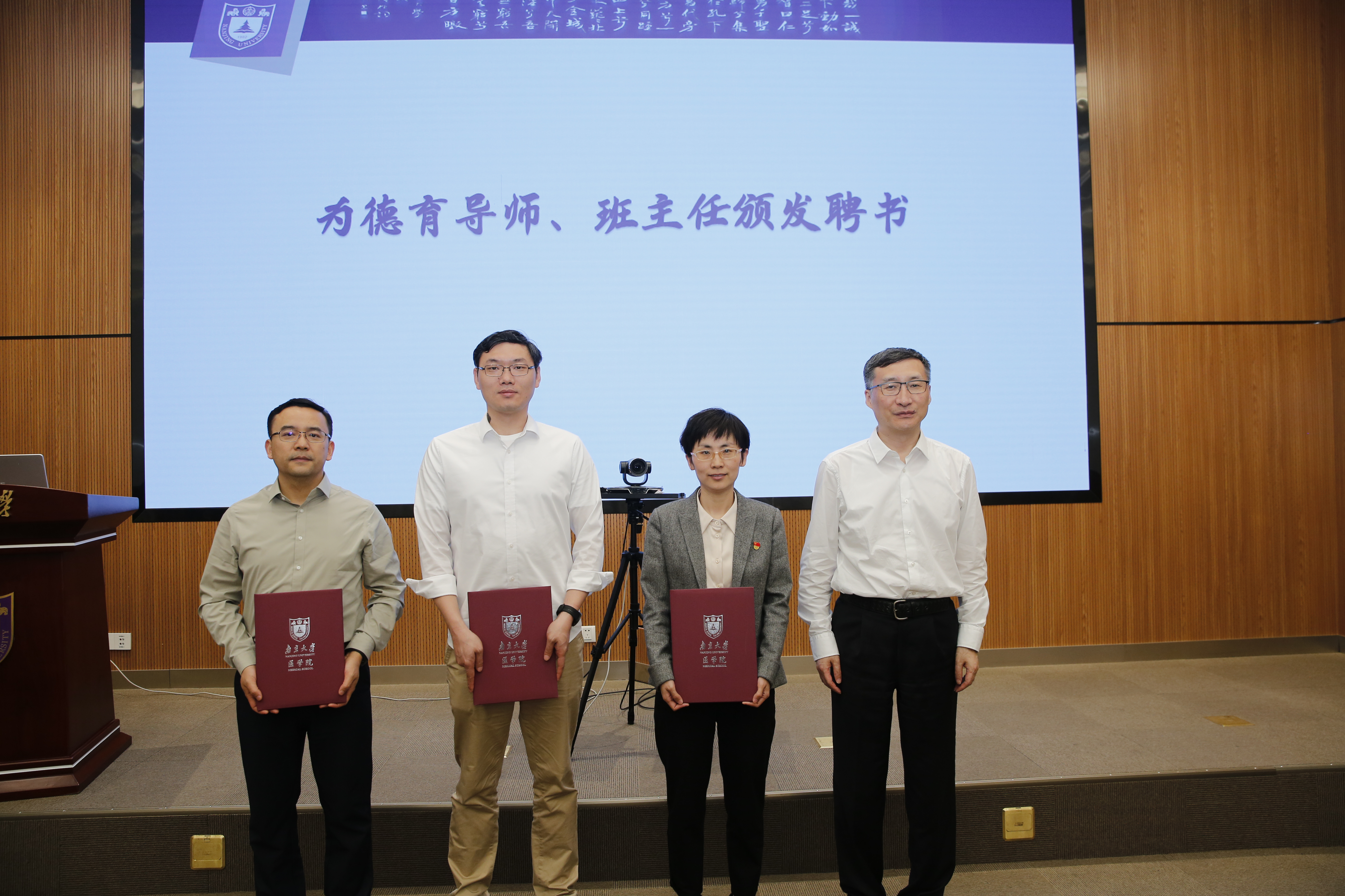 随后沈苏南宣读德育导师、班主任聘任的决定。张峻峰以及附属医院各位领导为德育导师、班主任颁发聘书。附属口腔医院的苗雷英主任作为德育导师代表发言,苗雷英从“育才”、“引才”、“用才”三方面分享了自己担任德育导师的经验,提出要充分搭建师生沟通平台,做好育教融合,强化思想引领,抓好专业学习,因材施教,充分了解学生特点。医学院赵越老师作为班主任代表发言,她回顾了担任班主任期间班级感受,号召班主任要付出一切努力,发扬南大式奋进精神,育教融合,为奋力开创学院育人工作新局面做出自己的贡献。附属鼓楼医院赵晓智作为附属医院代表做育人工作经验交流。他指出过去一年里鼓楼医院切实落实医学院相关要求,扎进推进育教融合,全力配合医学院进行德育导师、班主任的遴选、培训工作,扎实做好师资培训、课堂教学培训并健全师资评价体系,真正做到“思政育人”,“三全育人”,搭建了具有鼓楼医院特色育人体系。
