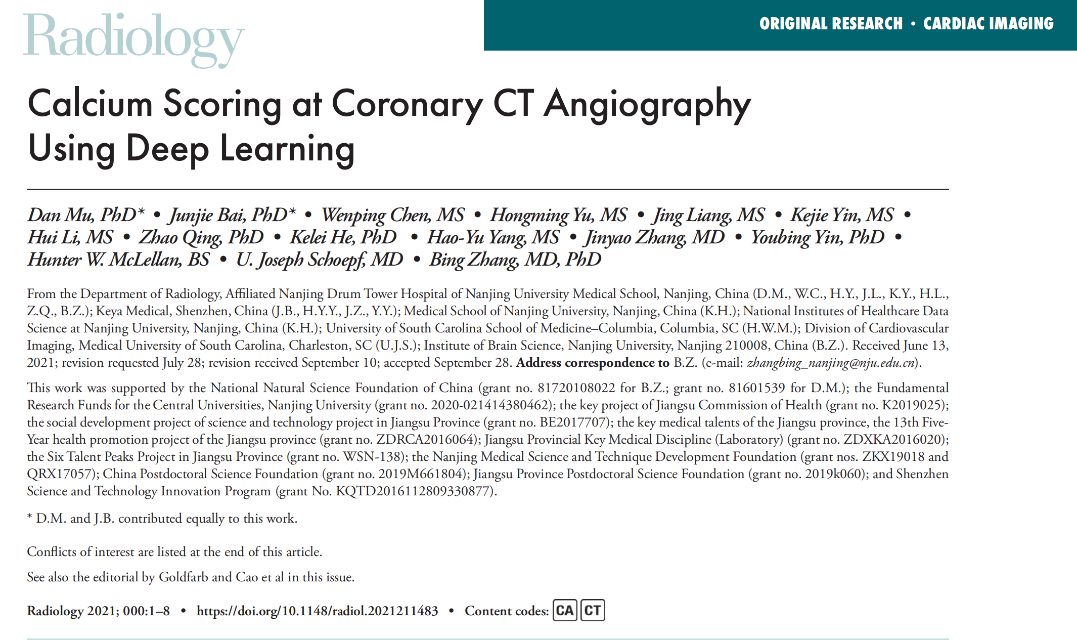 该研究以 “Calcium Scoring in Coronary CT Angiography using Deep Learning”为题首登放射学顶级期刊Radiology上, 医学院附属鼓楼医院医学影像科牡丹为本文第一作者,张冰教授为通讯作者。来自纽约罗斯林圣弗朗西斯医院和心脏中心的心血管影像科学家 James W. Goldfarb博士和心血管影像中心主任 J. Jane Cao博士同期发表述评:临床工作中可以省去增强CTA前的平扫,直接进行钙化积分,既降低辐射剂量,又提高准确率。