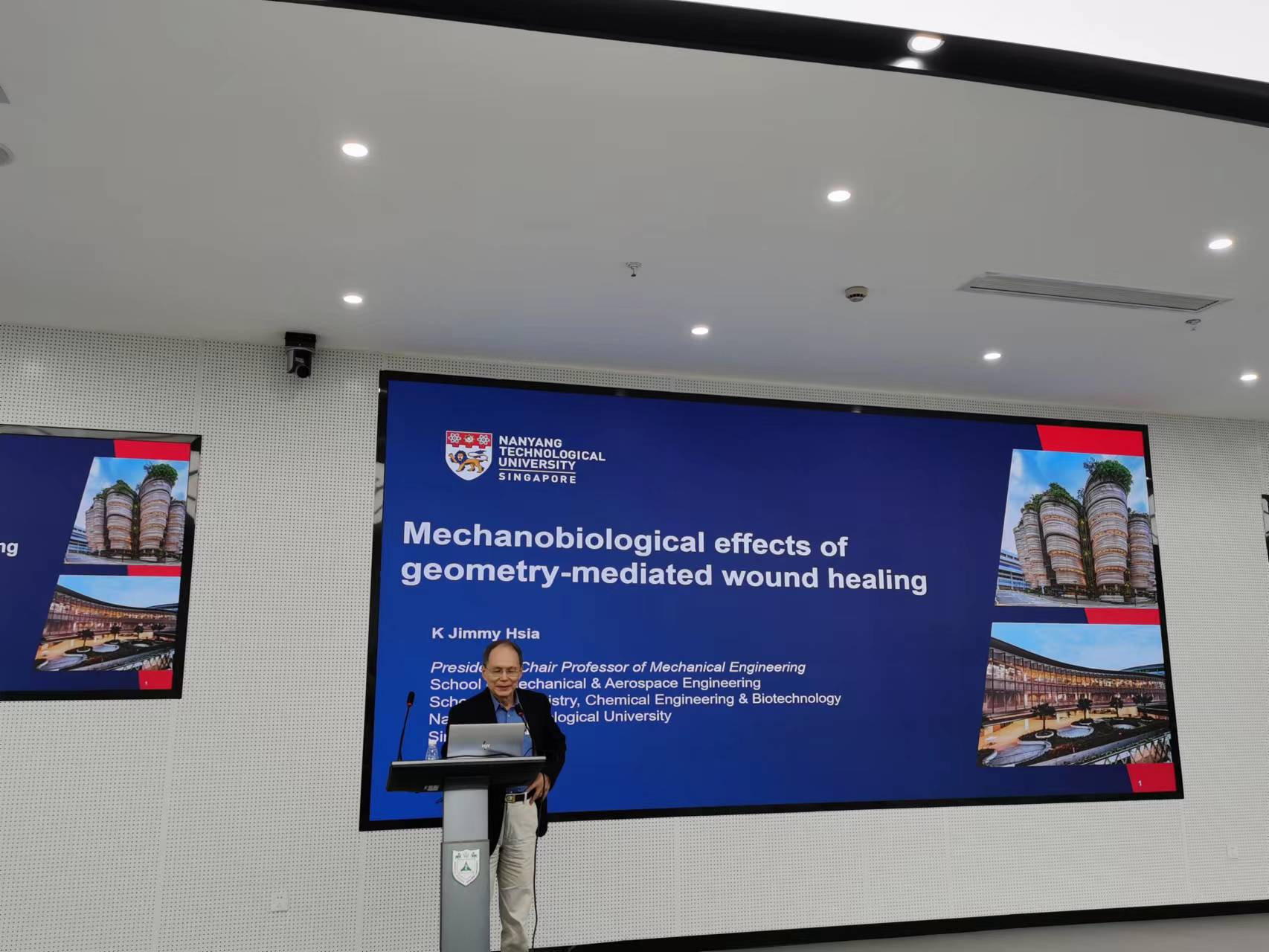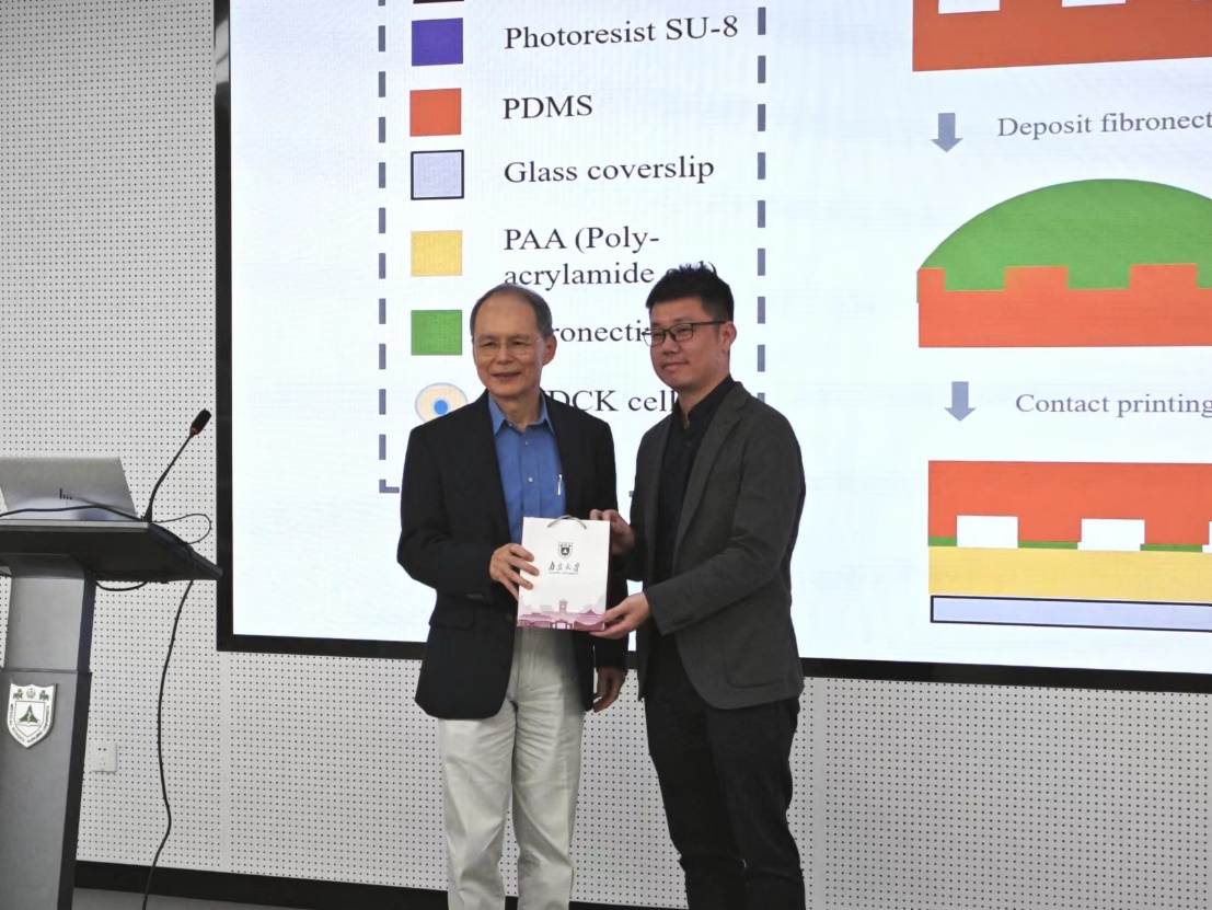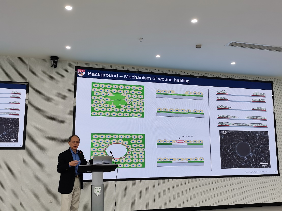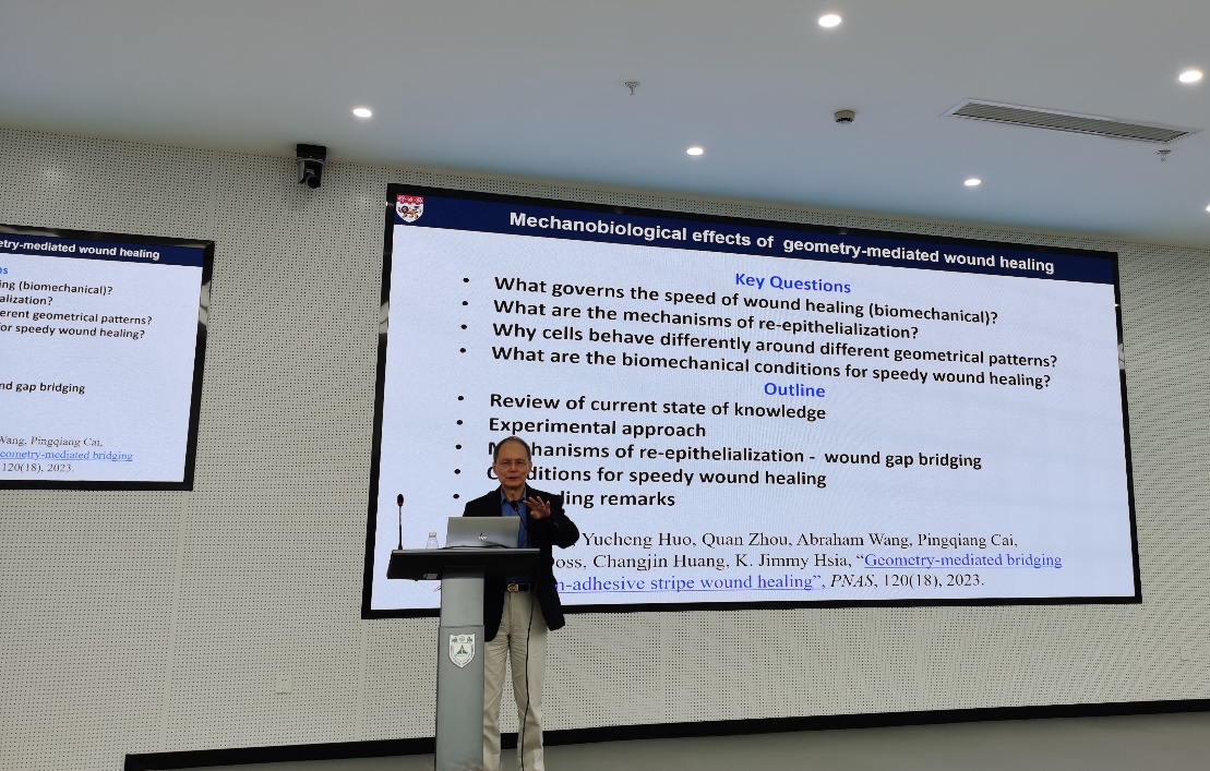 下午两点三十分,K. Jimmy Hsia教授在医学院基础科研楼一楼报告厅做了题为“Mechanobiological effects of geometry-mediated wound healing”的学术报告。在本次报告中,K. Jimmy Hsia教授首先简单介绍了南洋理工大学近些年的发展情况,而后介绍了由不同几何形状伤口的愈合速度启发的上皮细胞对间隙曲率反应的相关研究。K. Jimmy Hsia教授的精彩报告引起现场师生的热烈讨论,气氛十分热烈。此次报告不仅加深了南京大学医学院师生对力学生物学的认识,还为医学、材料学、力学等交叉领域的研究提供了新思路。