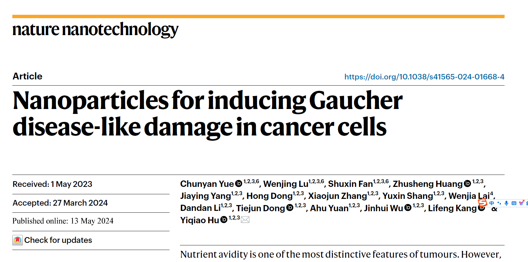 2024年5月13日,医学院胡一桥团队在Nature Nanotechnology在线发表题为“Nanoparticles for Inducing Gaucher Disease-like damage in cancer cells”的研究成果。胡一桥教授为本文通讯作者;团队助理研究员岳春燕为论文第一作者,硕士研究生陆雯静和范书新为论文的共同第一作者;团队成员吴锦慧教授、袁阿虎副教授和董虹高级工程师均参与了该项工作。该研究获得国家自然科学青年基金等项目支持。