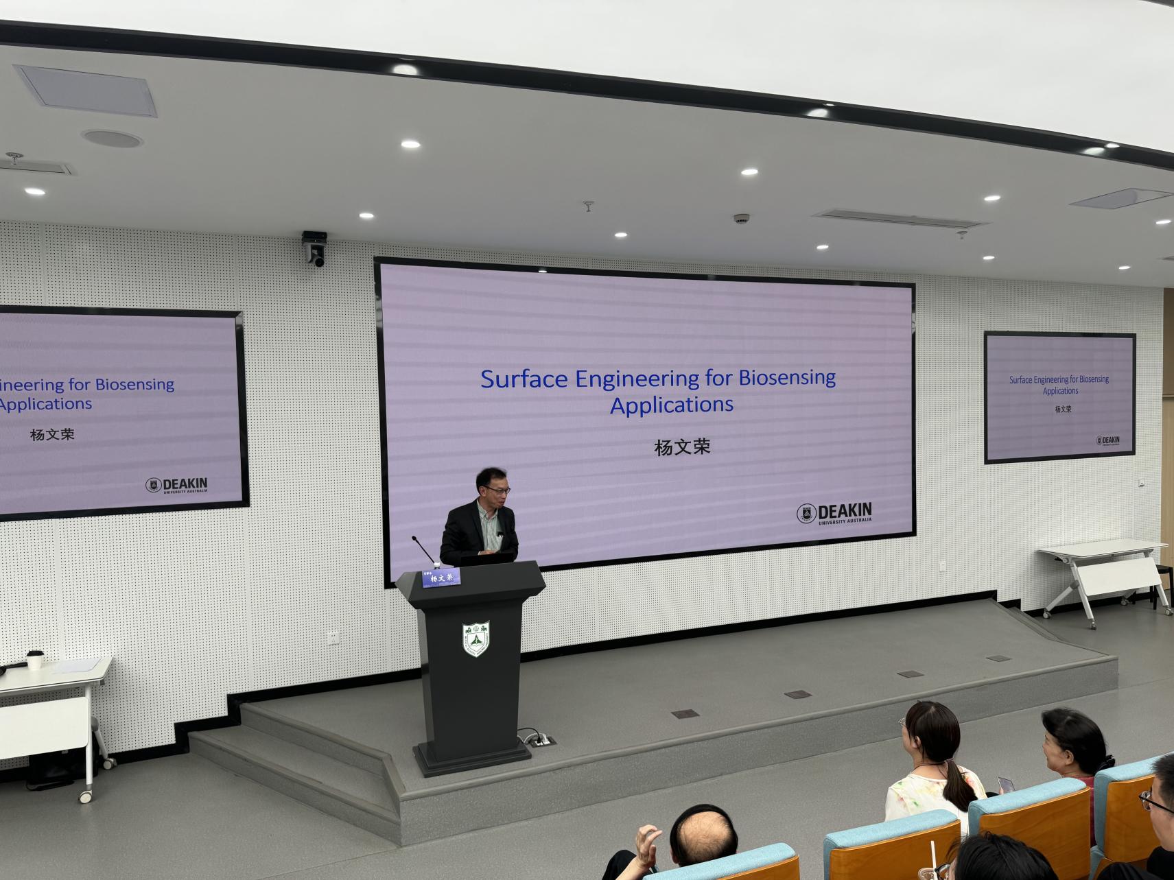 接着,来自澳大利亚迪肯大学的杨文荣教授带来了关于“Surface Engineering for Biosensing Applications”的讲座,他介绍了在电子化学领域最新的科研进展和技术应用,让医学生从另一个视角看到了新兴技术的发展趋势,启发学生思考医学与新技术结合的可能,他的讲授让同学们充分感受到科学研究的兴趣和乐趣。