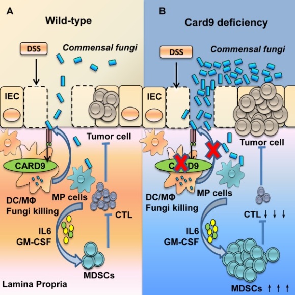 2018年9月18日,南京大学医学院王婷婷教授课题组和清华大学医学院免疫学研究所林欣教授课题组在Cell子刊 《Immunity》杂志(IF:19.72)在线发表题为 《The adaptor protein CARD9 protects against colitis-associated colon cancer by restricting mycobiota- mediated expansion of myeloid-derived suppressor cells》的研究论文。