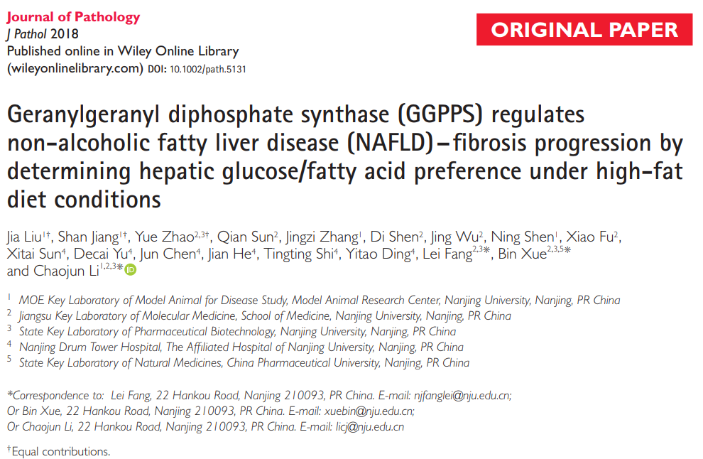 近日,我校医学院李朝军、薛斌课题组在国际权威期刊《The Journal of Pathology》上发表论文,阐述了蛋白质异戊二烯化对非酒精性脂肪肝(NAFLD)发展成肝纤维化的调控作用,提示肝脏糖脂代谢的偏好能够促进NAFLD向纤维化、硬化乃至肝癌的转化,为肝脏疾病癌变的早期干预提供了新的治疗和诊断靶标。