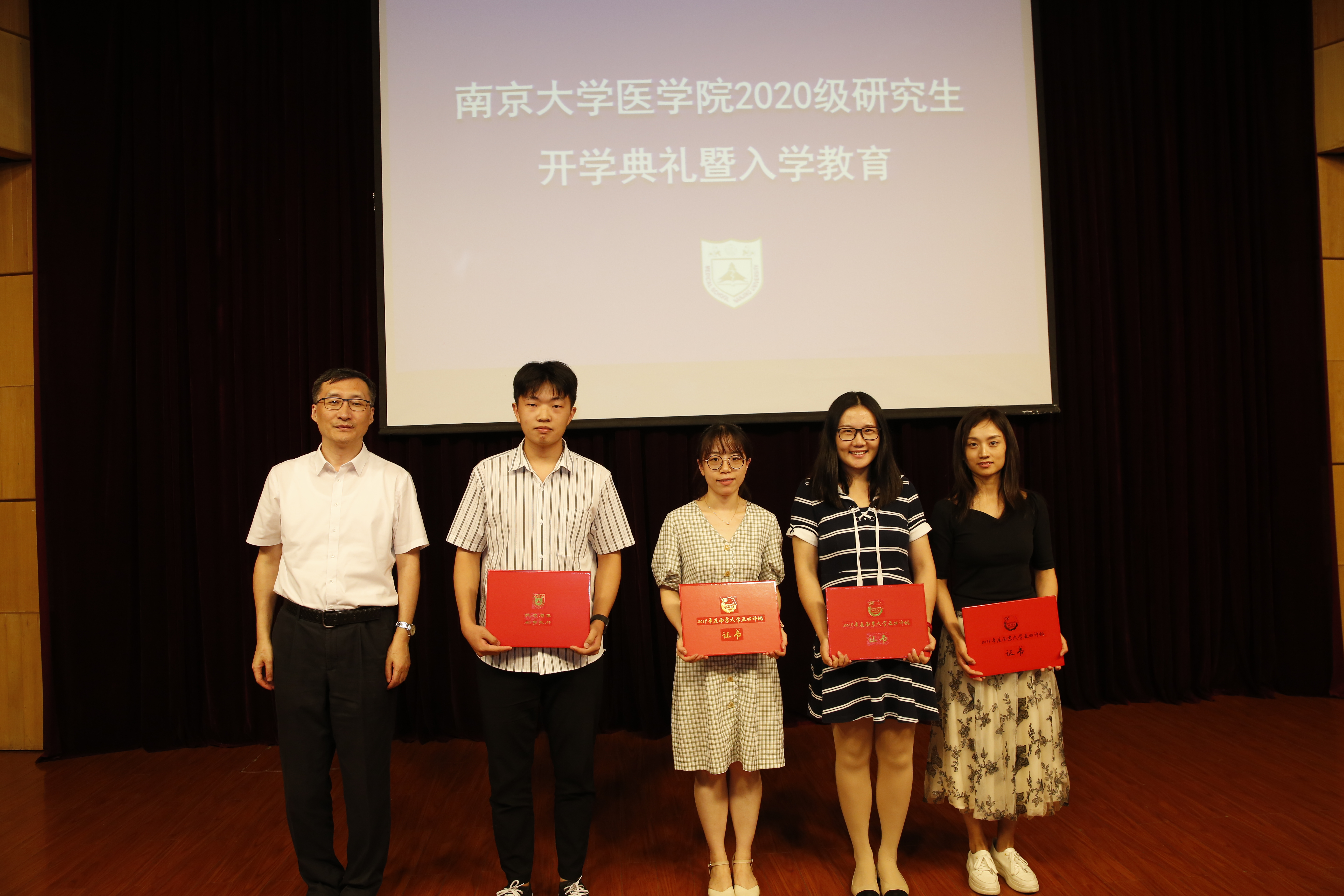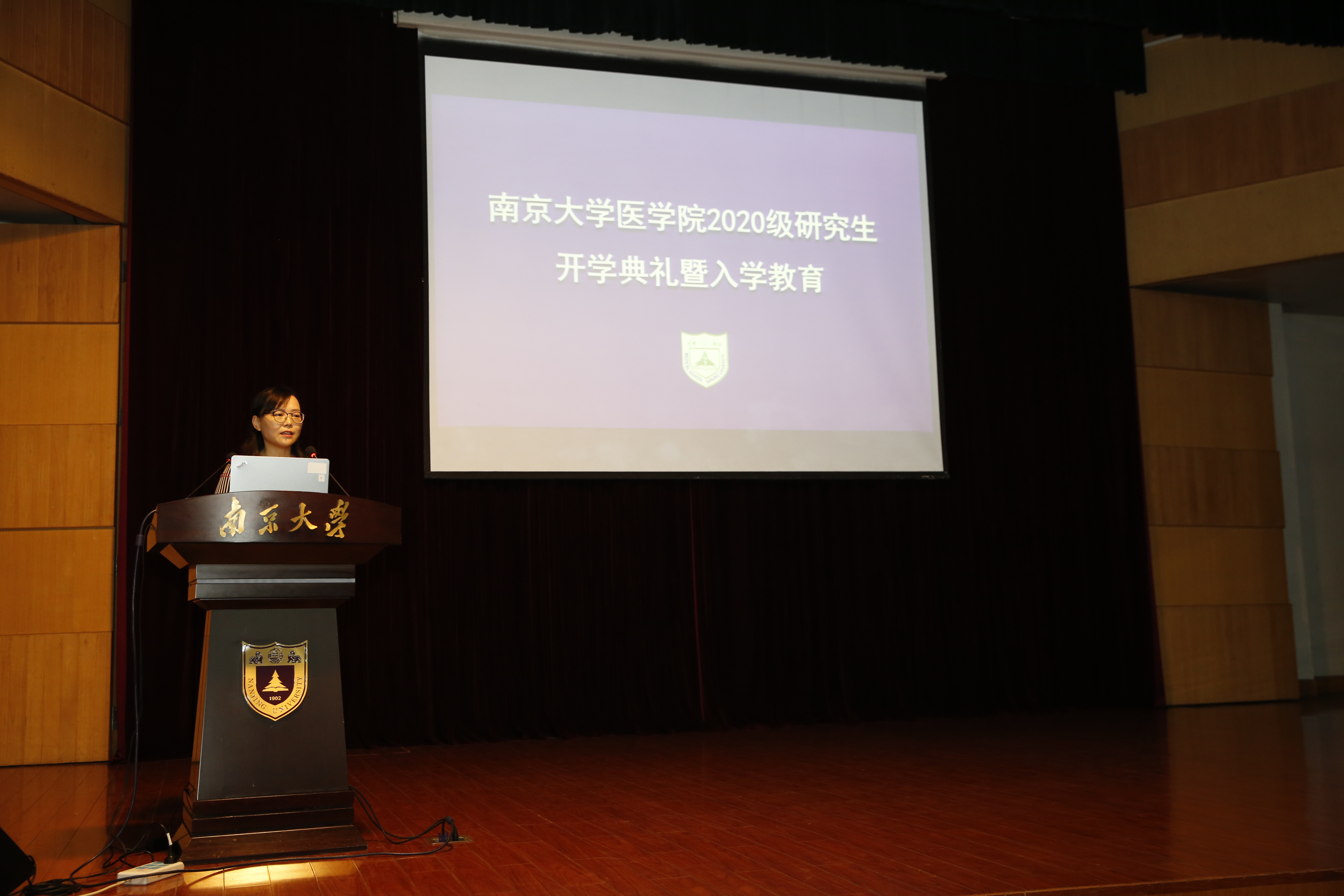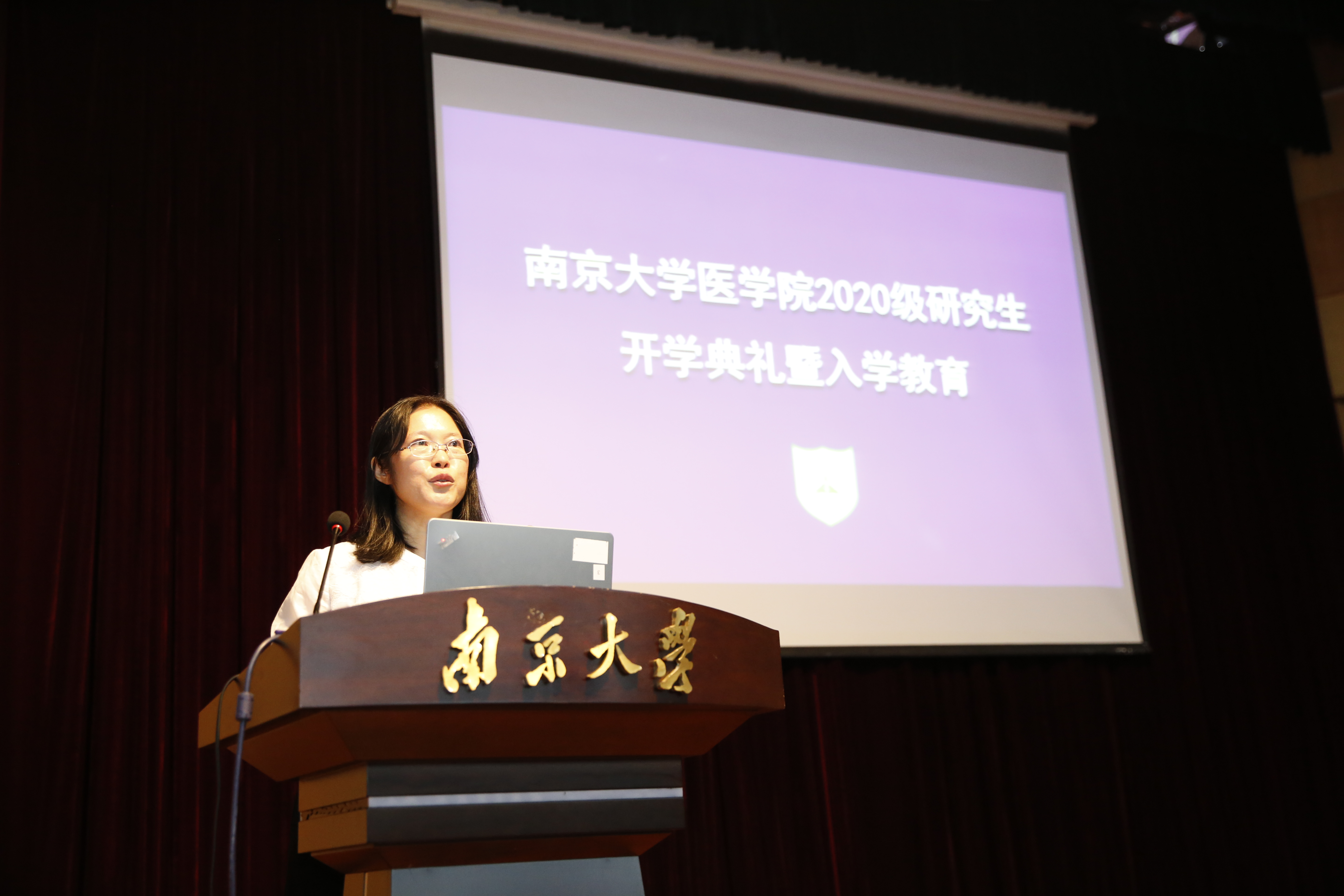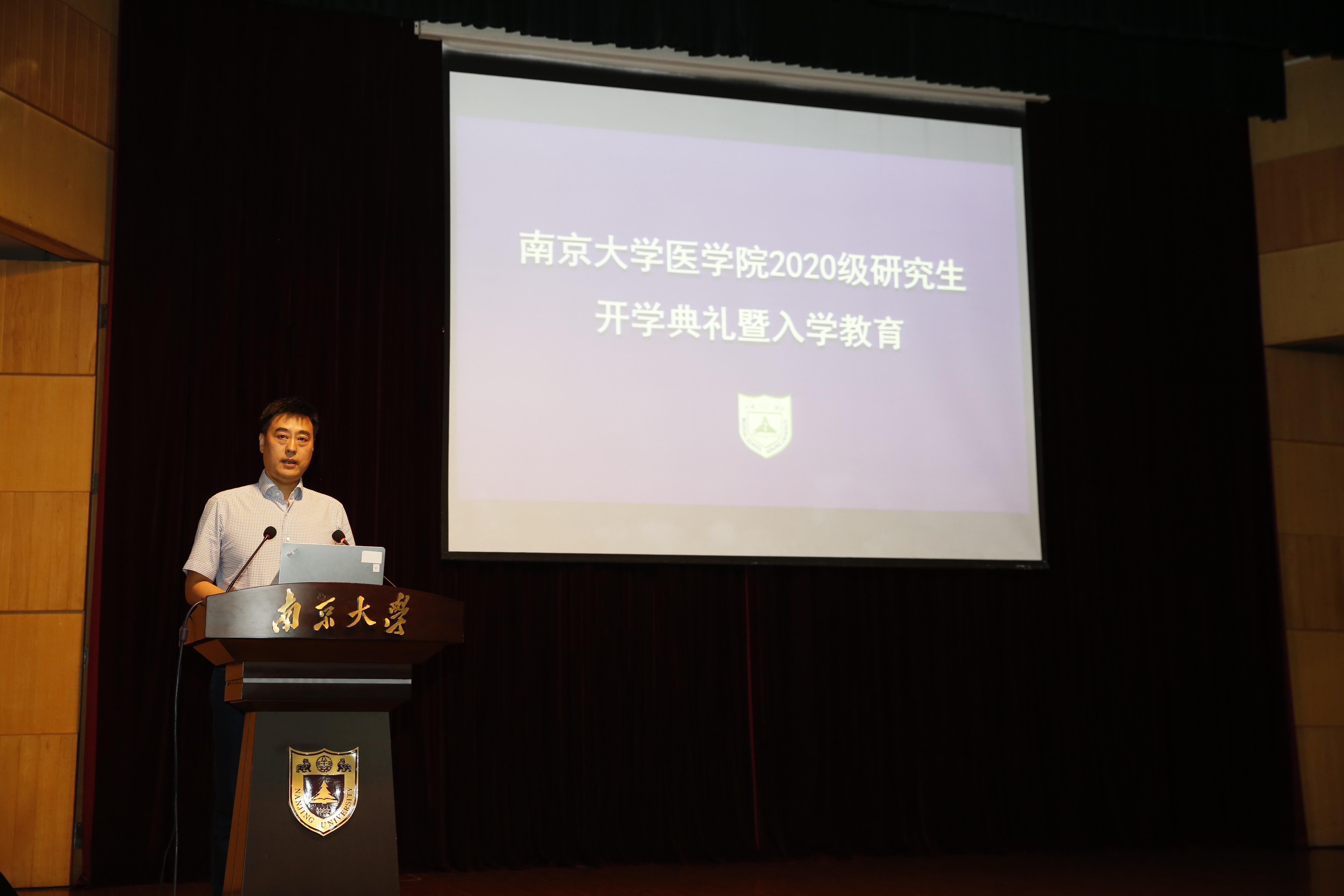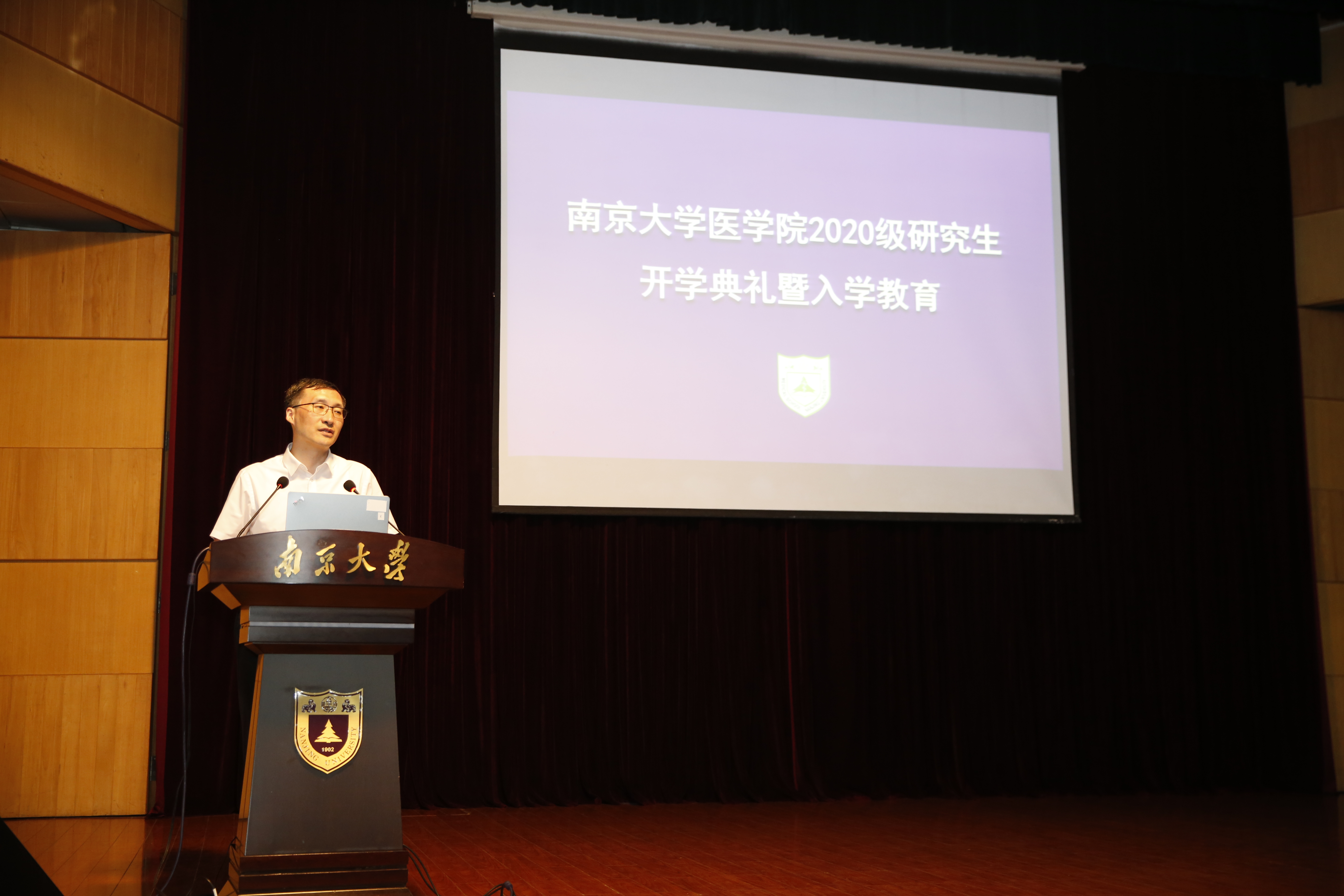 九月金陵,丹桂飘香,南京大学医学院迎来了一批研究生新同学,9月9日下午1点医学院2020级研究生开学典礼暨入学教育大会在鼓楼校区科技馆报告厅举行。南京大学党委常委、副校长、医学院院长张峻峰,党委书记韩晓冬,副院长蒋青、沈苏南、王宏伟、王婷婷,附属鼓楼医院周玉皆处长、附属金陵医院卫勤部苏义副部长、附属口腔医院谢思静科长、附属泰康仙林鼓楼医院陈锦飞副院长,医学院博士生导师、附属金陵医院心胸外科主任申翼,医学院校友、附属鼓楼医院肿瘤科副主任魏嘉,医学院教师代表及2020级全体研究生新生参加开学典礼。典礼由医学院党委副书记王阿妮主持。
