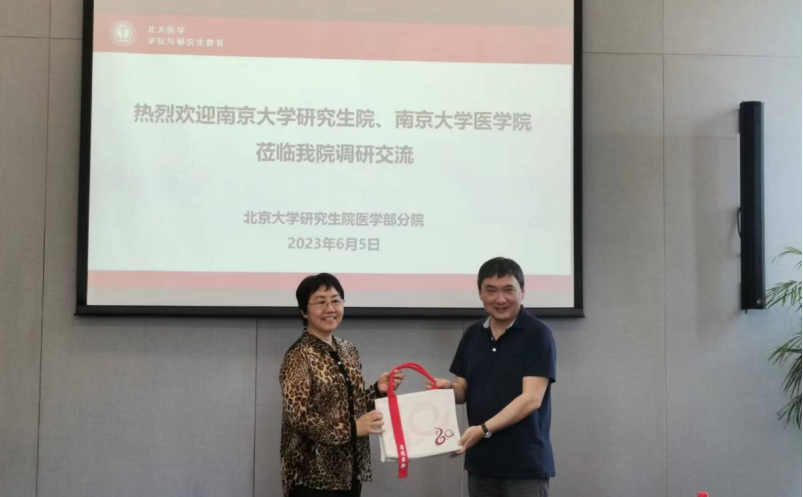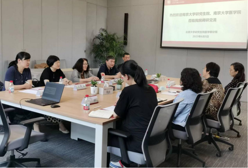 为全面贯彻党的二十大报告关于“坚持教育优先发展,全面提高人才自主培养质量,着力造就拔尖创新人才”的要求,深入开展学习贯彻习近平新时代中国特色社会主义思想主题教育,积极落实南京大学“奋进行动”方案,6月5日,在南京大学研究生院副院长卞清和学位办主任吴晓曼的带队下,南京大学医学院党委书记沈苏南、副院长蒋青、副院长王婷婷及附属鼓楼医院副院长周敏、附属金陵医院教学办主任顾怀敏等一行赴北京大学医学部开展调研交流活动。北京大学研究生院医学部分院相关领导及职能部处负责同志参加调研,并进行了座谈交流。