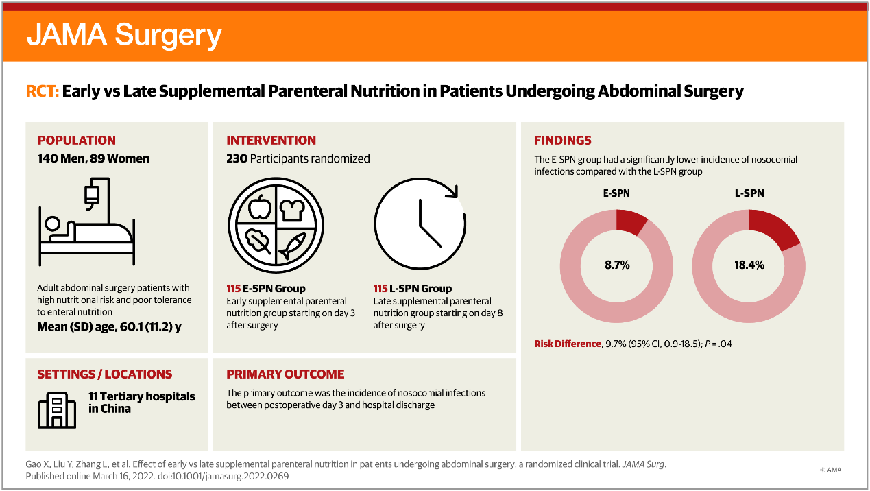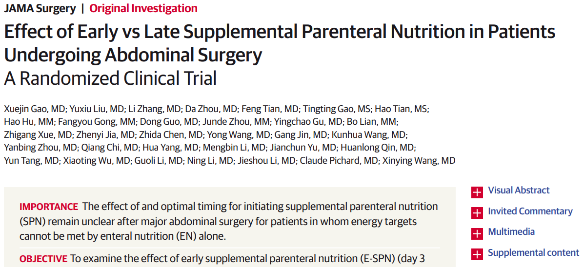 2022年3月16日,南京大学医学院附属金陵医院(东部战区总医院)普通外科王新颖教授团队在国际外科学顶级期刊《JAMA Surgery》(美国医学会杂志外科学,影响因子14.8分)杂志,在线发表题为《Effect of Early vs Late Supplemental Parenteral Nutrition in Patients Undergoing Abdominal Surgery: A Randomized Clinical Trial》一项重大临床研究成果。《JAMA Surgery》创刊于1920年,是医学四大期刊之一《JAMA》美国医学会杂志的系列成员。本研究是国际上第一个探讨腹部外科病人术后补充性肠外营养应用时机的多中心临床随机研究,也是中国学者在《JAMA Surgery》上发表的首篇外科营养领域的多中心临床研究。