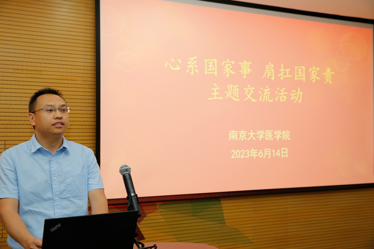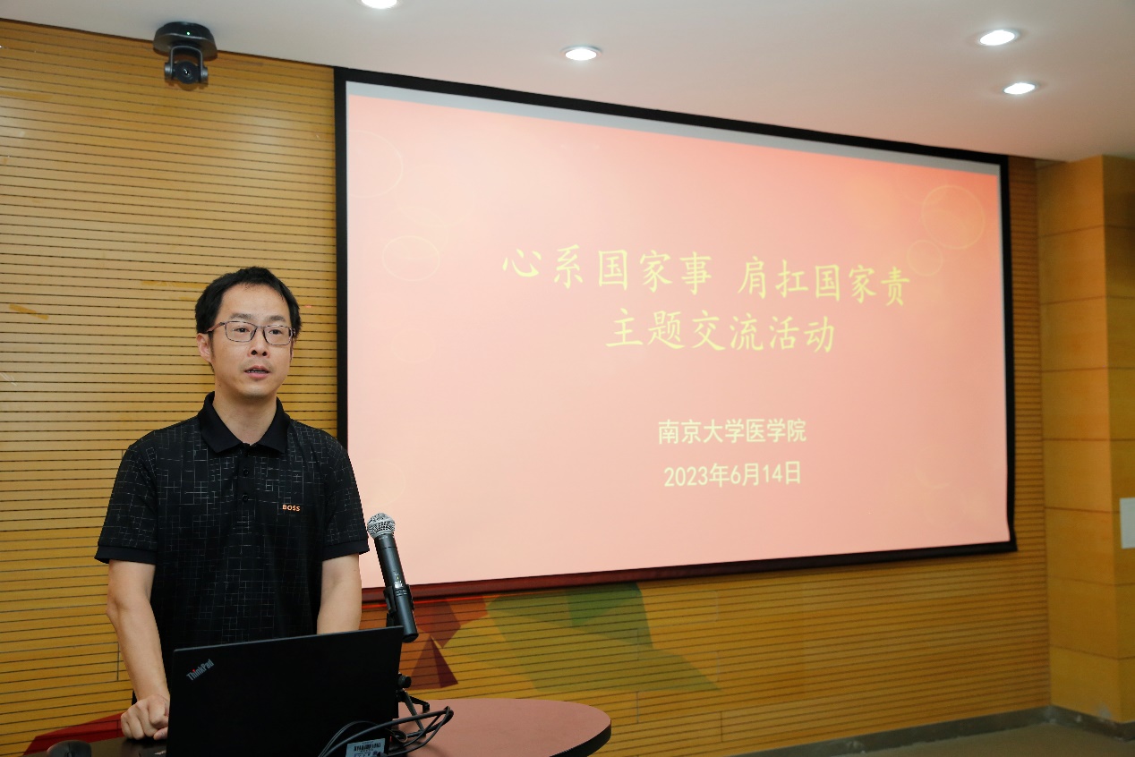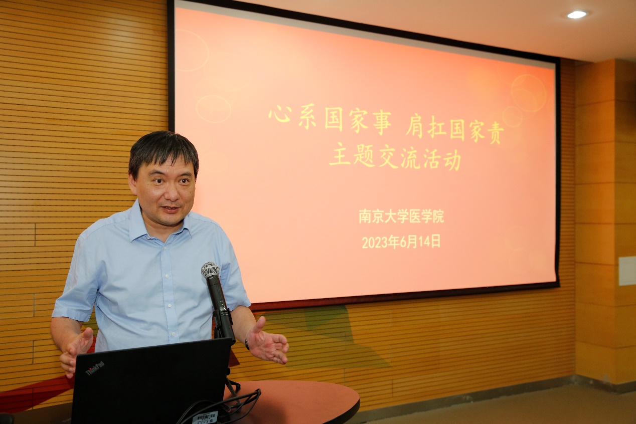 沈苏南强调,在总书记回信一周年之际,开展此次活动具有重要意义。2022年5月18日,在南京大学120周年校庆前夕,习近平总书记给南京大学留学归国青年学者回信,勉励南大人要“心系国家事’、肩扛国家责”,“在坚持立德树人、推动科技自立自强上再创佳绩,在坚定文化自信、讲好中国故事上争做表率”, 引发了医学院全体师生的热烈反响。沈苏南指出,给总书记写信的南京大学120名留学归国青年学者中有4位医学院青年教师,他倍感骄傲与自豪,并邀请洪浩、甘振继两位教师代表进行发言。