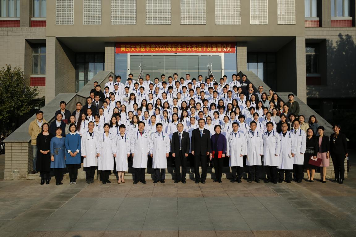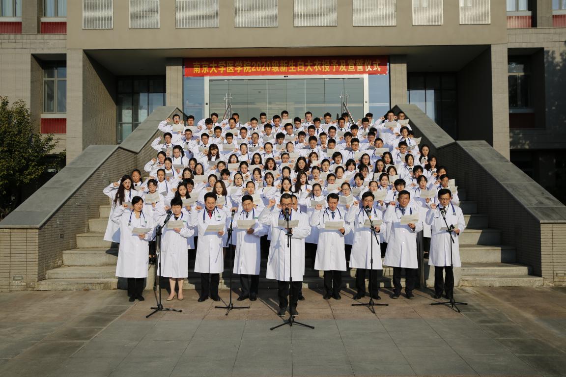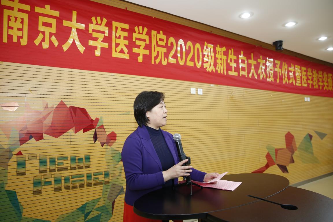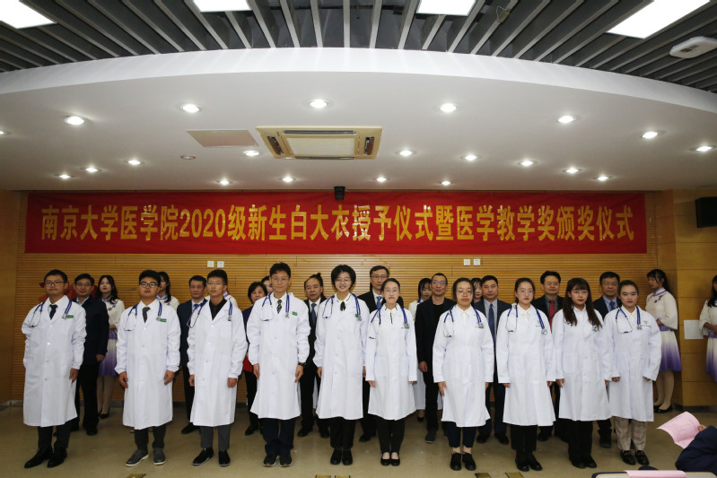 2020年10月24日下午,南京大学医学院2020级新生白大衣授予仪式暨教学奖颁奖仪式于仙林校区基础医学教学中心顺利举行。南京大学副校长、本科生院院长王志林,南京大学副校长、医学院院长张峻峰,附属口腔医院院长杨旭东,附属鼓楼医院副院长孙倍成,附属金陵医院(解放军东部战区总医院)党委常委、护理部主任朱冬梅,附属盐城第一医院党委书记查文章,附属苏北人民医院院长束余声,附属泰康仙林鼓楼医院副院长陈锦飞,南京市第二医院副院长殷国平,南京脑科医院副院长张丽,南京大学新生院安邦书院学生事务中心主任吴可,医学院校友代表、98级校友陈罡,医学院副院长蒋青、沈苏南、王宏伟、王婷婷,党委副书记王阿妮以及附属医院和教学医院分管教学的领导和老师出席活动。医学院党委书记韩晓冬主持仪式。
