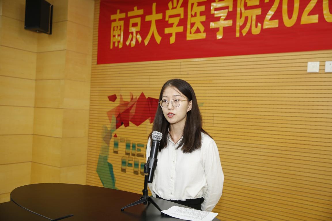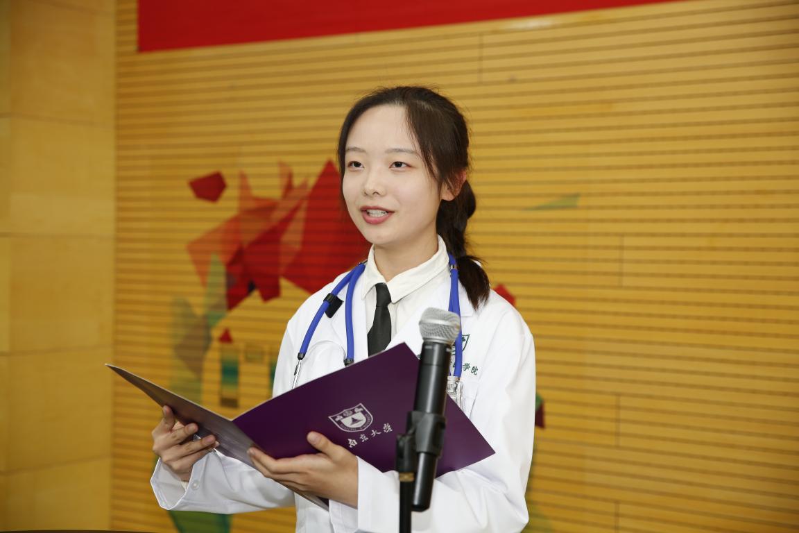 在校学生代表、2015级唐心怡同学发言。她为新生们分享了一些经验,希望同学们能够培养自主学习的习惯、把握学习的主动性;努力走出舒适圈挑战自己、发掘自己的无限可能;更希望同学们能够为了肩头的一份使命,付出一百二十分的努力,为日后成为医学的顶尖人才迈好坚实的每一步。