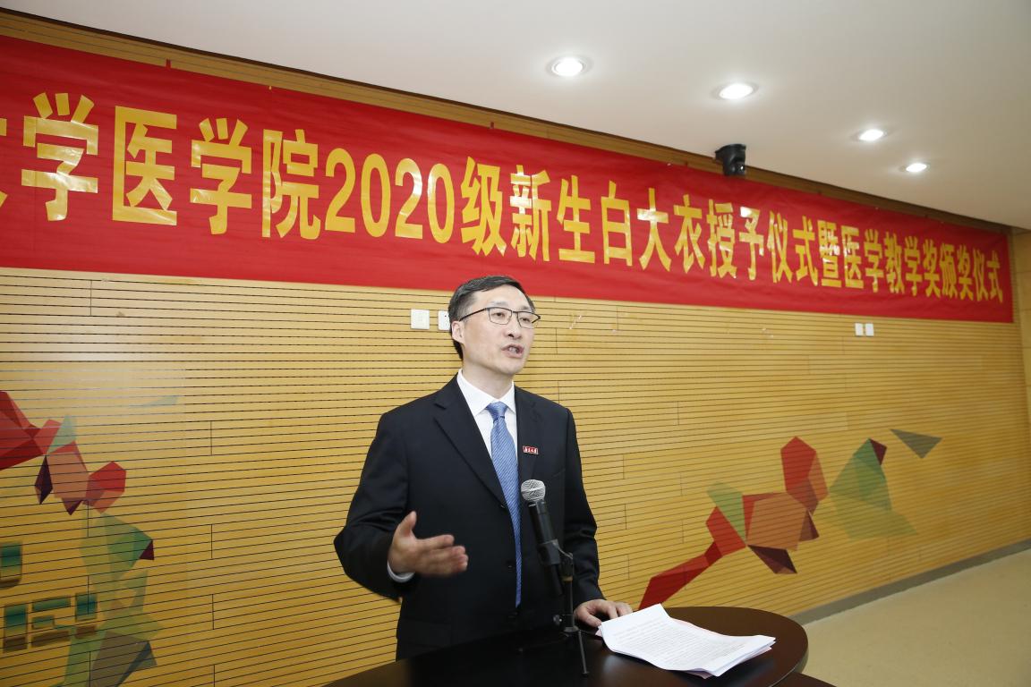 之后,张峻峰副校长发表讲话。他希望同学们不忘初心、坚守梦想,和前往抗疫一线的杰出校友们一样,勇敢地走向未知、迎接挑战;终身学习、全面发展,在学校先进的教学理念、学院和附属医院优质的基础设施和优秀的老师们的帮助下,提升临床技能、树立良好医德,养成终身学习的习惯,培养医学人文精神;兼顾科研临床,博学博专,齐头并进,用扎实的临床基础和出众的科研能力武装自己,实现的自己梦想,成为优秀的领导型临床学家和医学科学家。
