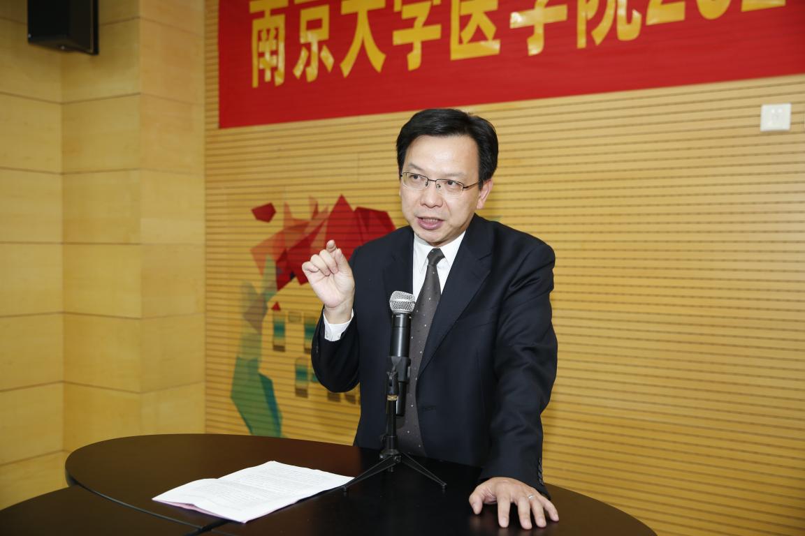 南京大学医学院98级校友、苏州大学第一附属医院副院长、教育部长江学者奖励计划青年学者、国家基金委优秀青年基金获得者陈罡作为校友代表发言。他对同学们能够幸运地进入南京大学医学院这个小而精的教学体系中学习表示祝贺。他认为学校为学生提供了很好的学习基础学科的平台,而这一点对于将来的临床至关重要。同时,他也希望同学们能够在学习医学课本知识的同时,思考并寻找自己今后临床和科研的方向。“进入南大医,代表着你们很优秀,”陈罡讲到,“但也需要大家足够的努力,将这份优秀保持下去。”