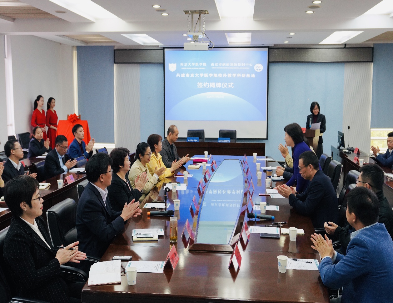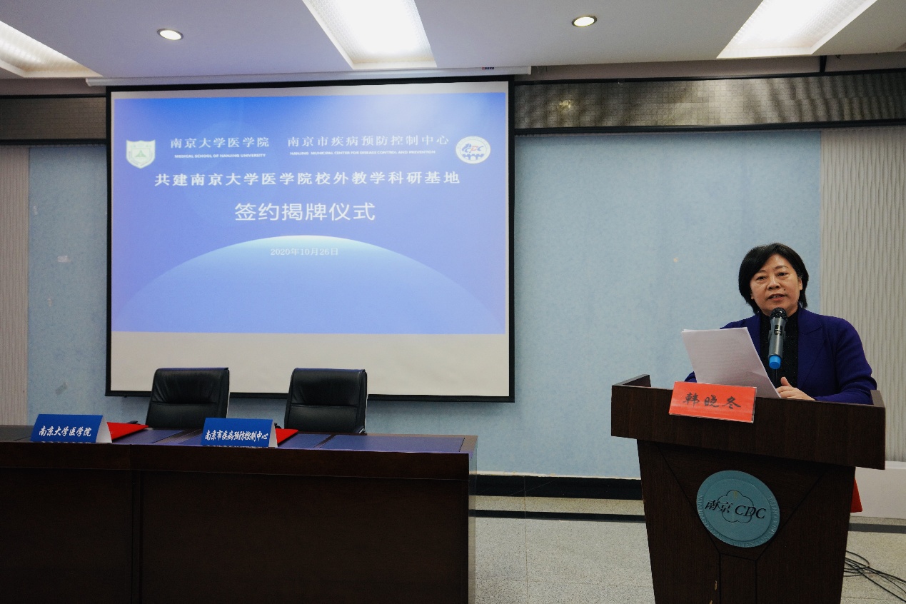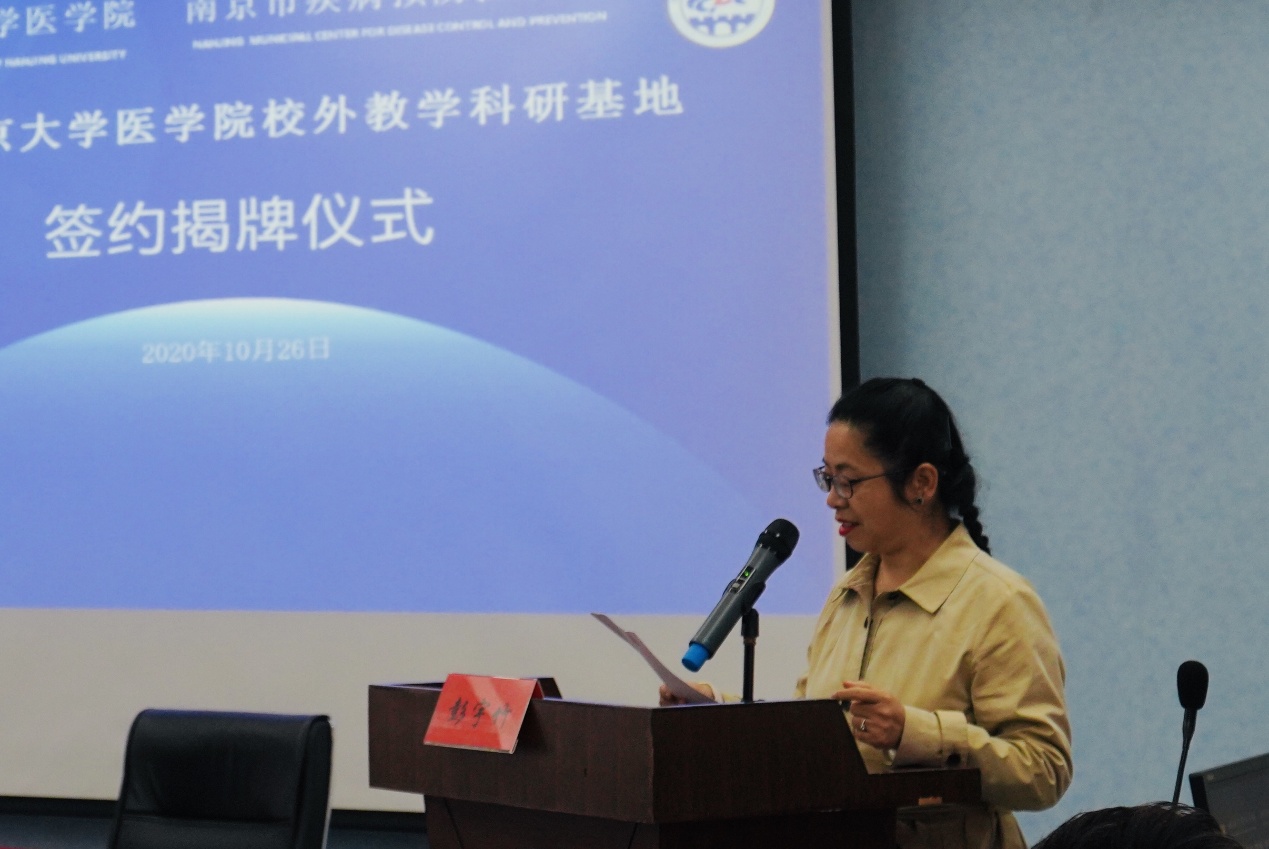 10月26日上午,南京大学医学院-南京市疾病预防控制中心共建的“南京大学医学院校外教学科研基地”签约揭牌仪式在南京市疾病预防控制中心三号楼会议厅举行。南京市卫生健康委党委副书记、副主任彭宇竹,科教处处长王倩,南京市疾病预防控制中心党委书记宋伟、主任周楠、副主任丁洁、副主任李成国、党委副书记陈敏,我院党委书记韩晓冬、副院长蒋青、副院长沈苏南、副院长王宏伟、办公室主任应锋、公共卫生学教授王守宇等出席揭牌仪式。仪式由南京市疾控中心副主任丁洁主持。