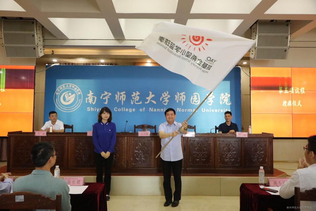 出征仪式上,全体人员共同观看了姚基金创始人姚明先生对全体支教志愿者的出征致辞视频。姚明先生的寄语朴实有力,我院志愿者深受鼓舞、倍感振奋。苏瑜秘书长将象征着奉献和服务的志愿者旗帜授予我院,李剑喜常务副院长接过旗帜后郑重地交到支教志愿者代表手中,传递志愿服务精神。最后,全体志愿者庄严宣誓:承诺将尽己所能,践行志愿精神,做好志愿服务。