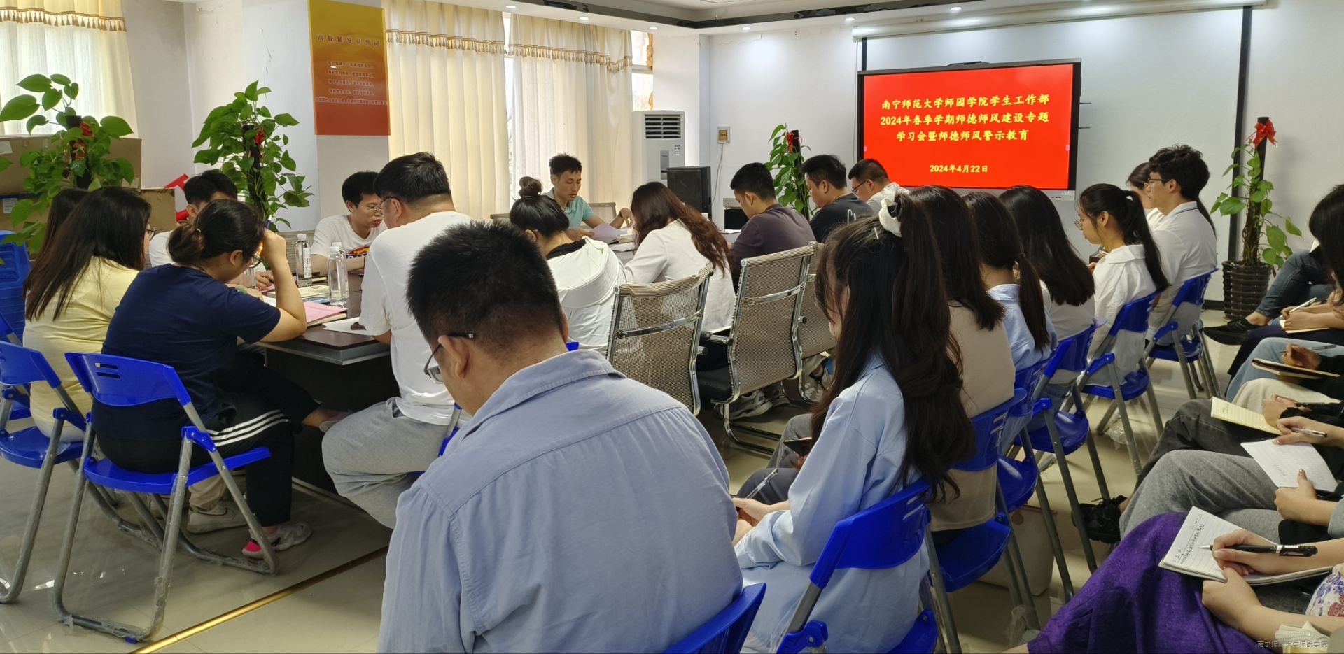 为深入贯彻落实党的二十大报告中提出的“加强师德师风建设,培养高素质教师队伍,弘扬尊师重教社会风尚”的重要决策部署,学习贯彻习近平总书记关于教育的重要论述和指示批示精神,坚决落实师德师风第一标准,加强师德师风建设,强化教师的责任感和使命感,夯实立德树人根基,4月22日上午,学生工作部在行政综合楼2楼会议室开展2024年春季学期师德师风建设专题学习会暨师德师风警示教育。本次会议由学生工作部部长叶栋主持,学工(团委)系统全体人员参会。