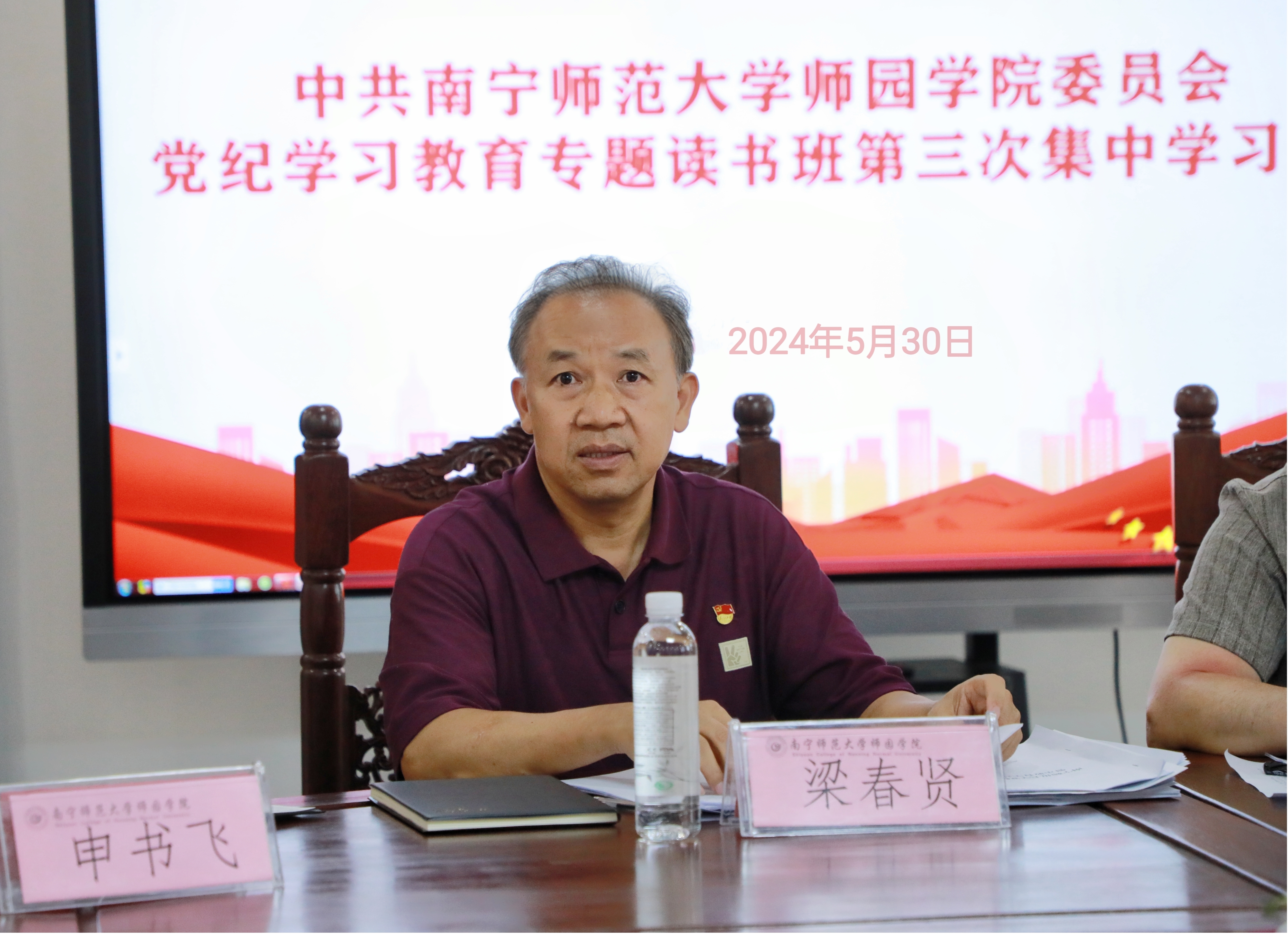 5月30日下午,我院在行政综合楼1002会议室召开党纪学习教育专题读书班第三次集中学习会议。学院领导班子党员领导、各党总支书记、直属党支部书记参加学习会议。学院副院长李德正、后勤处相关人员列席会议。会议由学院党委书记梁春贤主持。