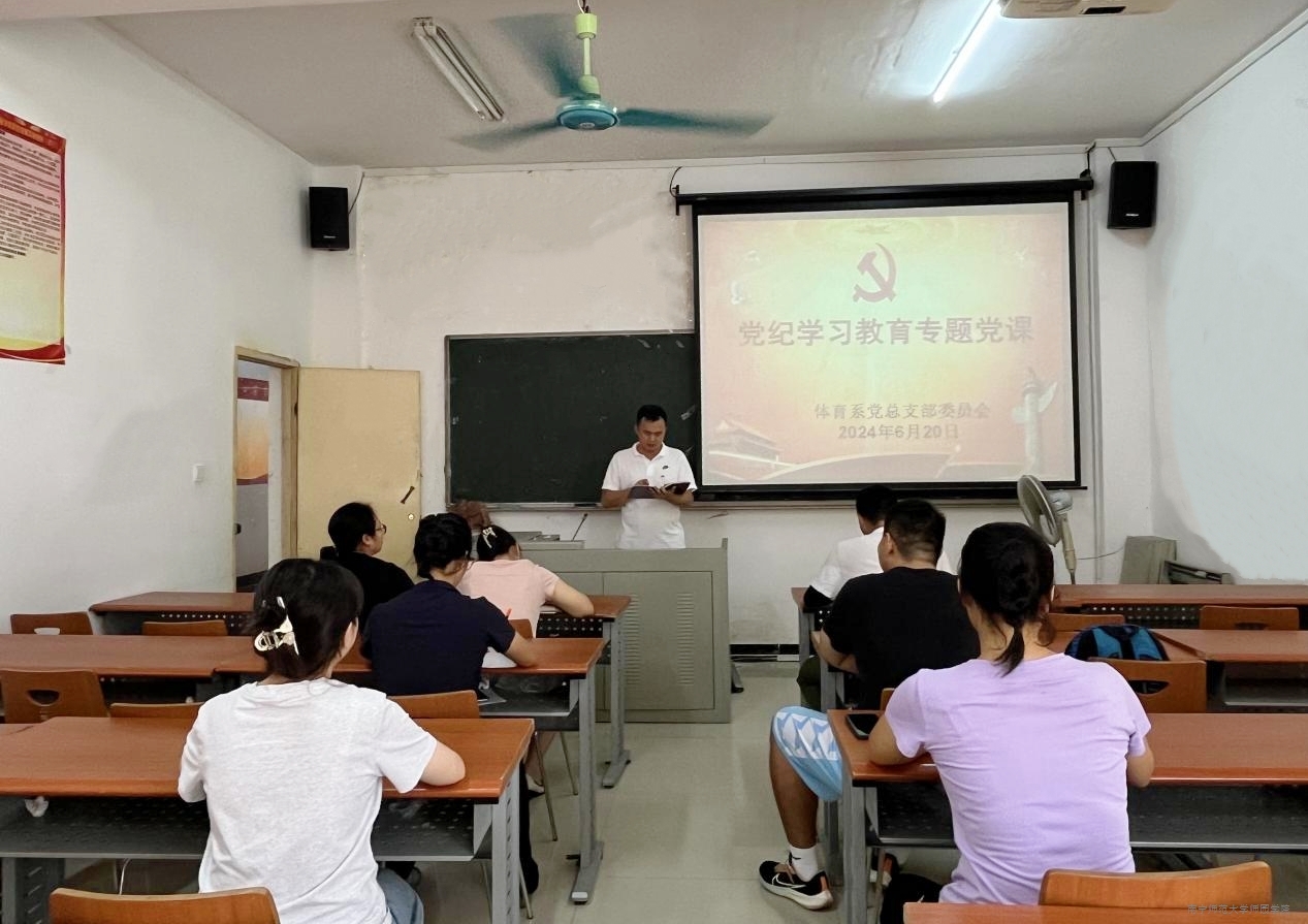 为持续深入推进党纪学习教育,进一步加强党风廉政建设,增强党员干部的党纪意识、纪律观念,6月20日中午,体育系党总支在文体楼204教室召开党纪学习教育专题党课。本次专题党课由体育系党总支书记邓朝主讲,体育系全体党员教师参加会议。