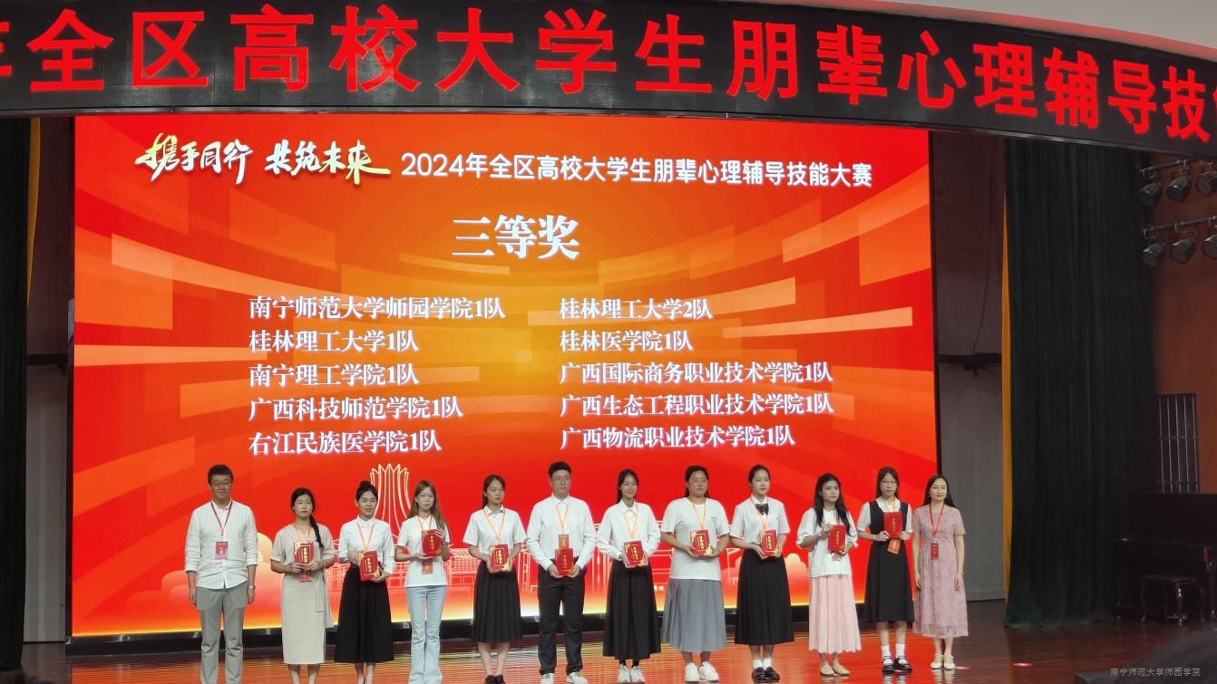 5月25日至26日,2024年全区高校学生朋辈心理辅导技能大赛决赛在南宁落下帷幕,我校选派的参赛队伍在决赛中荣获本科组三等奖。