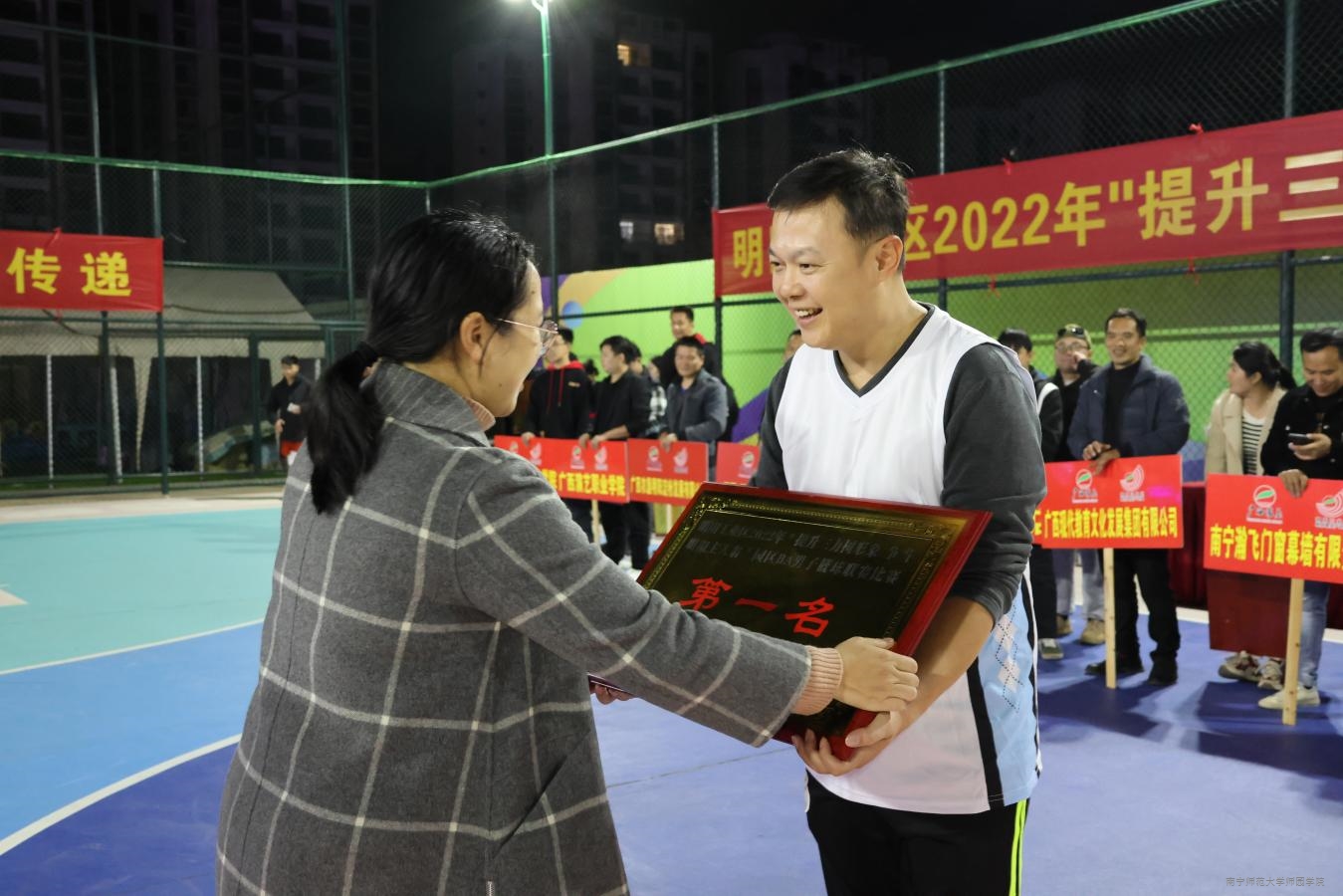 12月28日晚,明阳工业区“提升三力树形象 争当明阳主人翁”园区BA男子篮球联赛闭幕式暨颁奖庆典在明阳大道桂垦良品美食街篮球场举行,我院教职工篮球队获得冠军荣誉。
