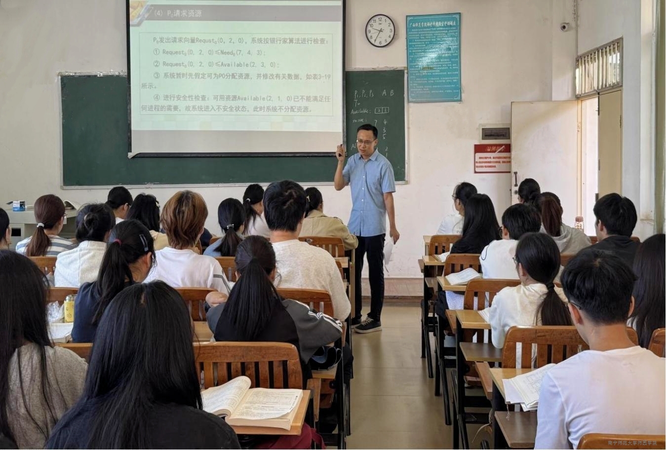 本次教学公开课由理工系吴昊老师主讲,授课内容为《避免死锁》。课堂上,吴昊老师通过回顾上节课的学习内容导入新课知识,并结合实际案例和具体例题向学生详细讲解了系统的安全状态和银行家算法的具体内容,带领学生学习和掌握避免死锁的方法。
