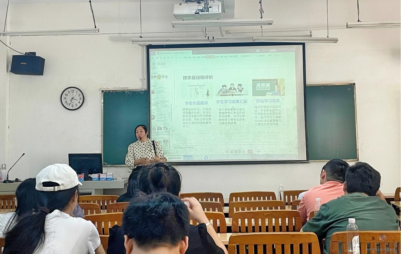 龚雪副主任以《数智时代如何让学生主动学习》为主题展开讲解。培训会上,她以AI人工智能在实际生活的应用为切入点,引入教育变革带来的挑战并通过“学习内容平均留存率金字塔”展示被动学习与主动学习的差异。随后,龚雪副主任详细阐述了数字化学习资源的特点与优势、数字化学习环境的学习模式。龚雪副主任指出,教师应重视数智化时代教育变革带来的挑战,努力提升自身学科素养,为学生提供多样性、交互性、个性化的学习资源,培养学生的创新能力和信息素养,从而提升教学质量,实现个性化教学。在培训会上,龚雪副主任还结合教育系教师教学的实情况提出了几个可实际应用的、具有创新性的互动式教学策略和课堂管理方法,并分享了多个成功的智慧教学案例,为与会教师们提供了宝贵的教学方法借鉴。