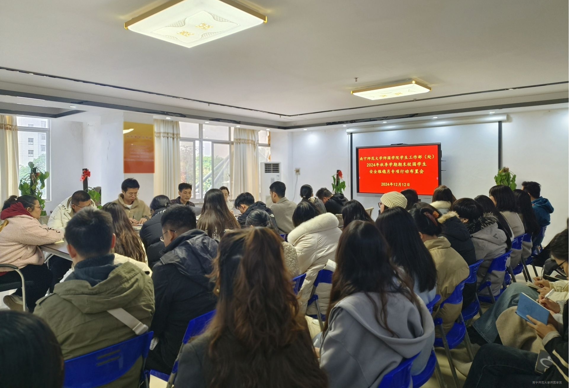 为进一步加强学期末学生安全稳定工作,压紧压实安全责任,确保2024年秋季学期期末各项学生管理工作平稳有序开展,切实保障全院学生的生命安全,维护和谐稳定的校园环境。12月12日上午,学生工作处于行政综合楼2楼202会议室召开2024年秋季学期期末校园学生安全维稳月专项行动布置会。学工处、院团委等全体人员参加本次会议,会议由学工处处长叶栋主持。