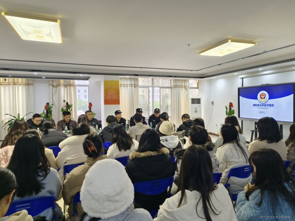 为完善校园反诈骗宣传教育体系,切实增强我院师生的反诈意识,维护和谐稳定的校园环境,12月12日上午,我院邀请南宁市公安局明阳派出所民警到校开展防范校园电信网络诈骗专题讲座。学生工作处处长叶栋、保卫处处长苏琳,学工处、院团委全体人员参加会议。会议由学生工作处处长叶栋主持。